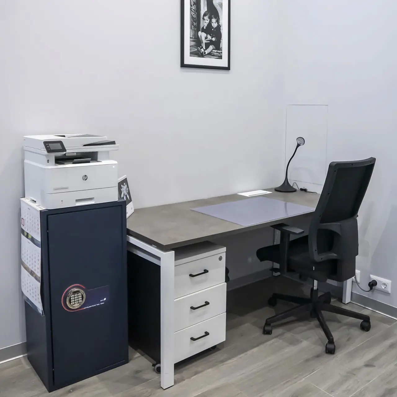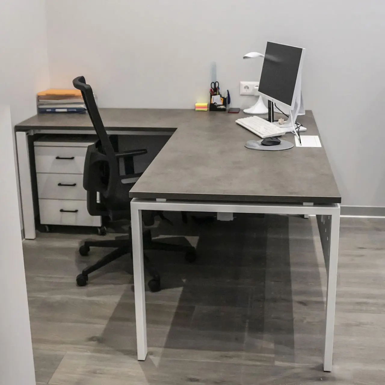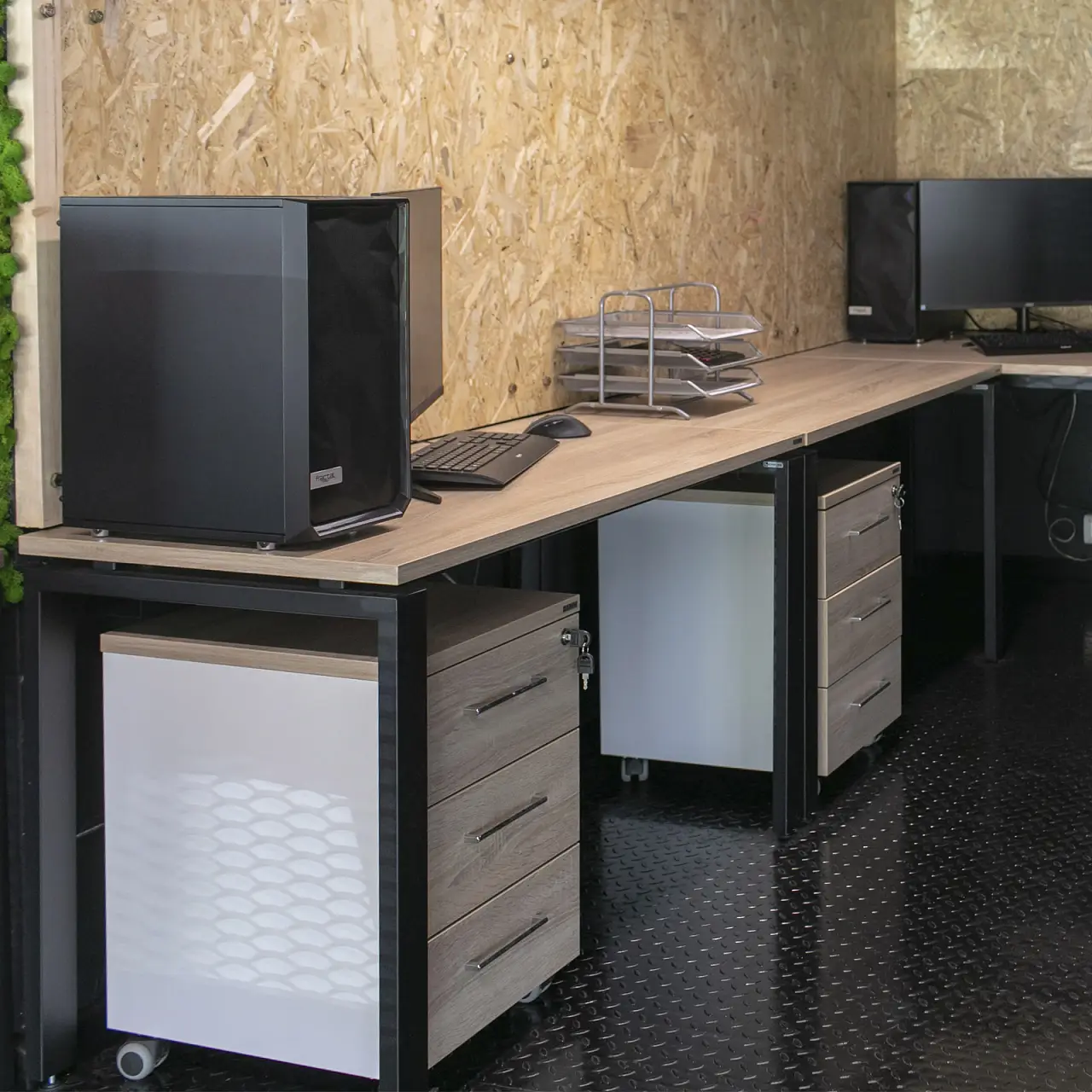Основу стола составляет прочный металлокаркас, обеспечивающий устойчивость конструкции и долговечность при постоянных нагрузках. Металлические опоры гарантируют стабильность даже при размещении оргтехники и дополнительного оборудования. Столешница выполнена из материала, зарекомендовавшего себя высокой плотностью, износостойкостью и устойчивостью к механическим повреждениям, влаге и ультрафиолету. Кромка защищает торцы и придает изделию аккуратный, завершенный вид.