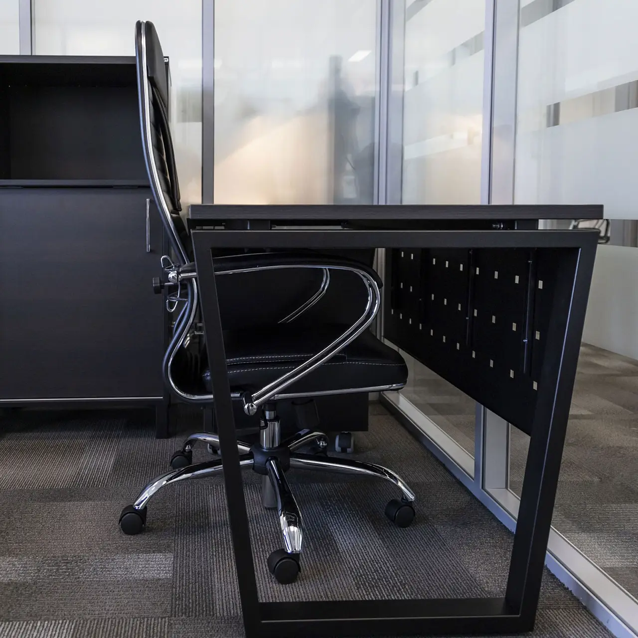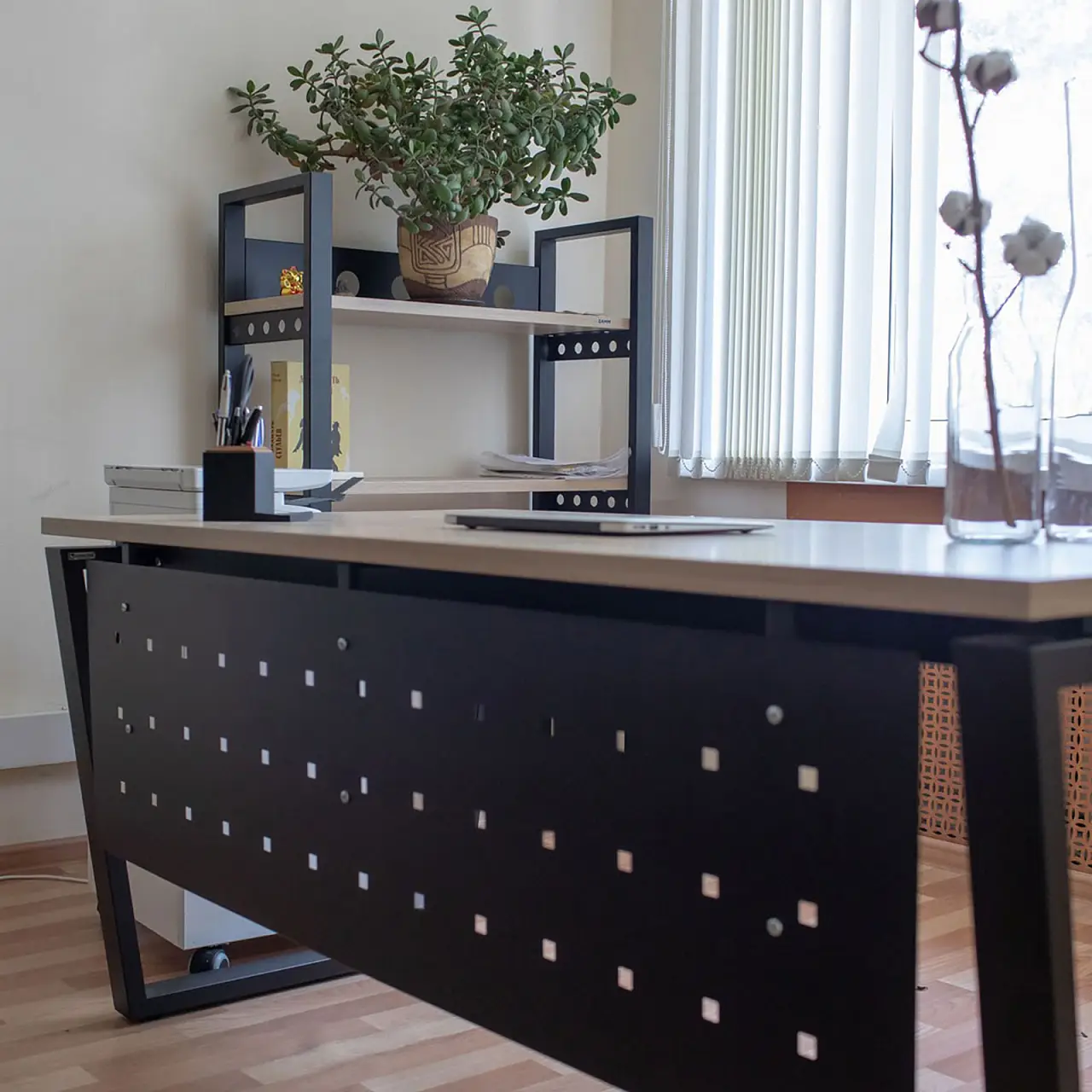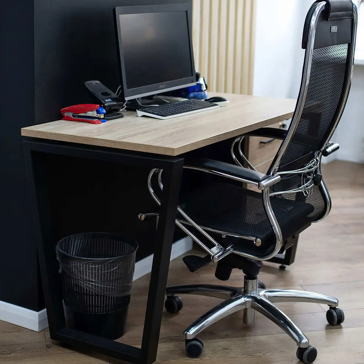 В основе используется надёжный металлокаркас, обеспечивающий стабильность и геометрию конструкции при длительной эксплуатации. Металлическое основание устойчиво к деформациям и рассчитано на размещение офисной техники и рабочих аксессуаров. Столешница выполнена из ЛДСП EGGER — материала с высокими показателями плотности и износостойкости, устойчивого к истиранию, влаге и перепадам температуры. Качественная кромка защищает торцы и повышает срок службы изделия.
