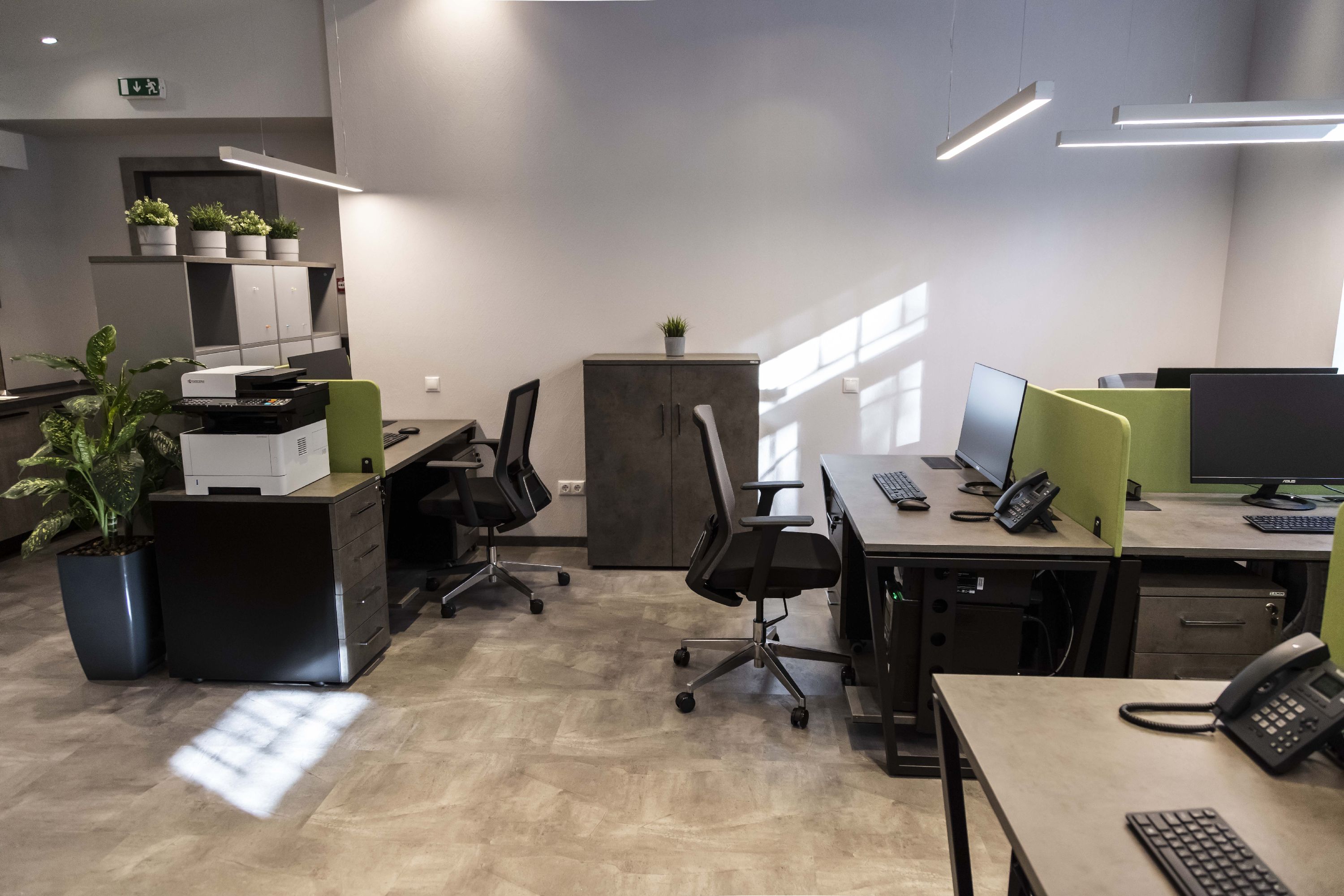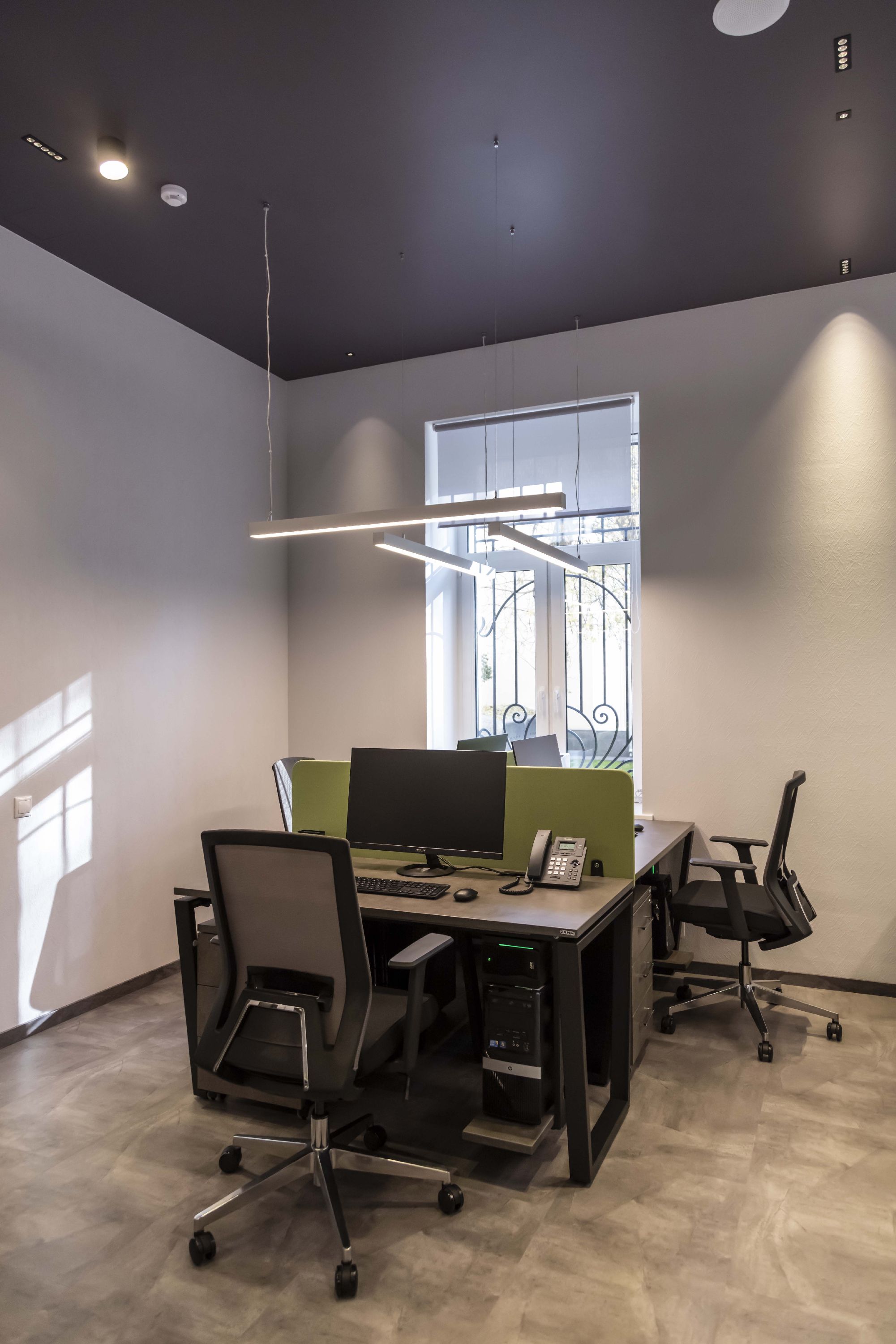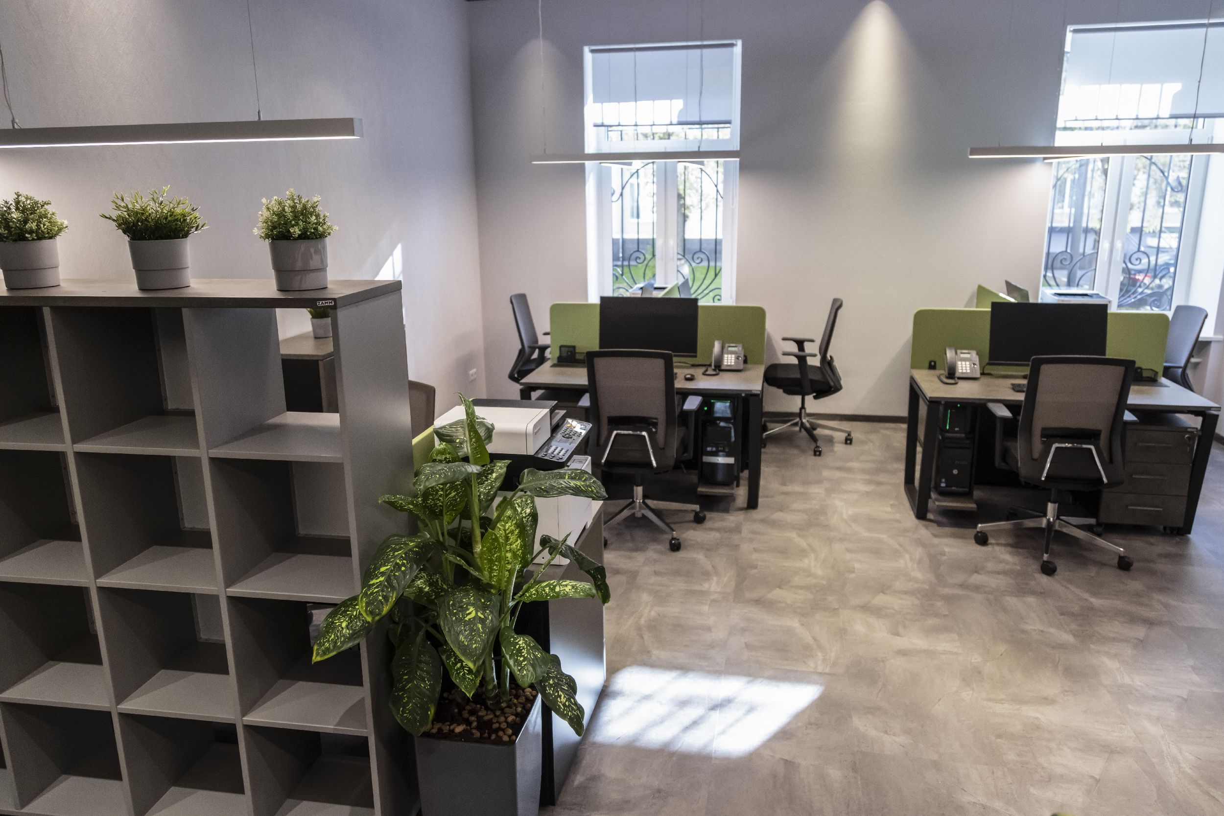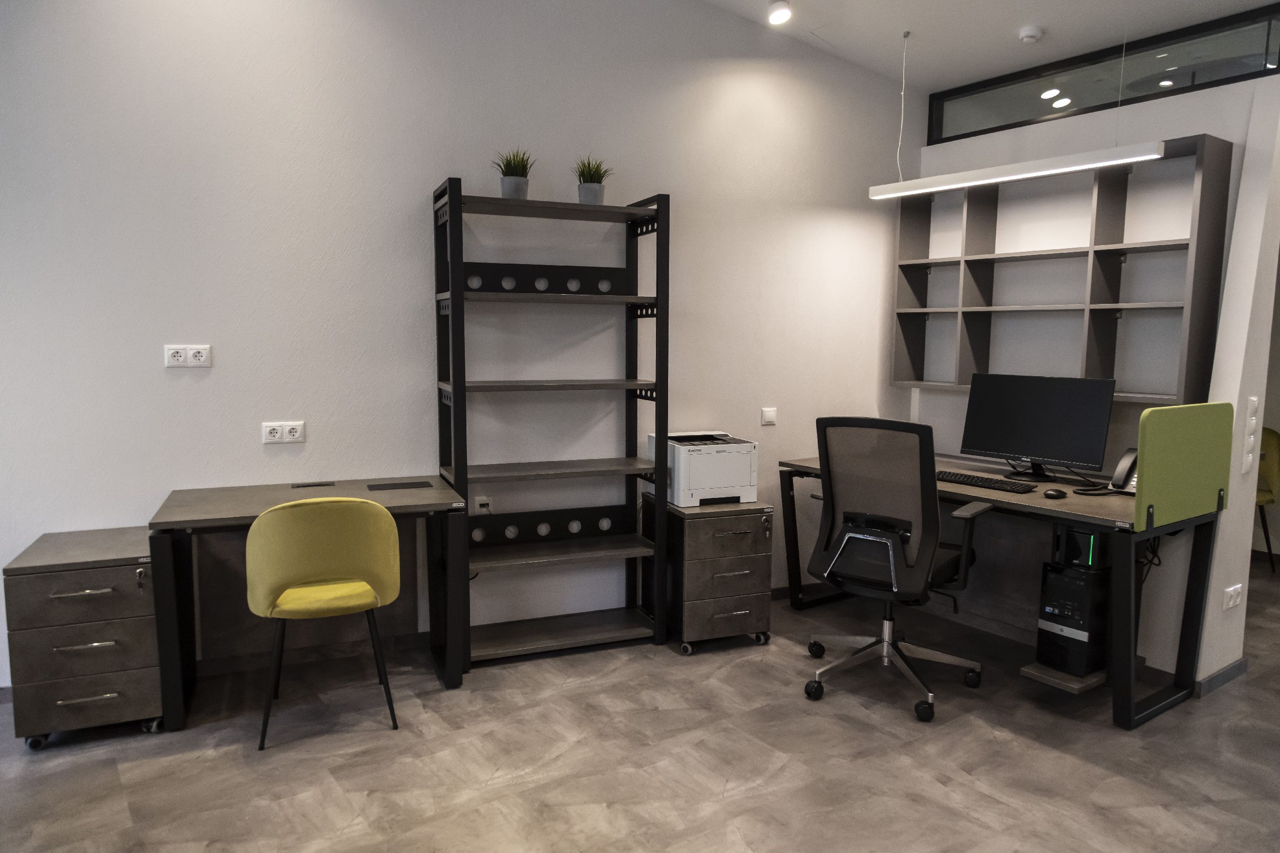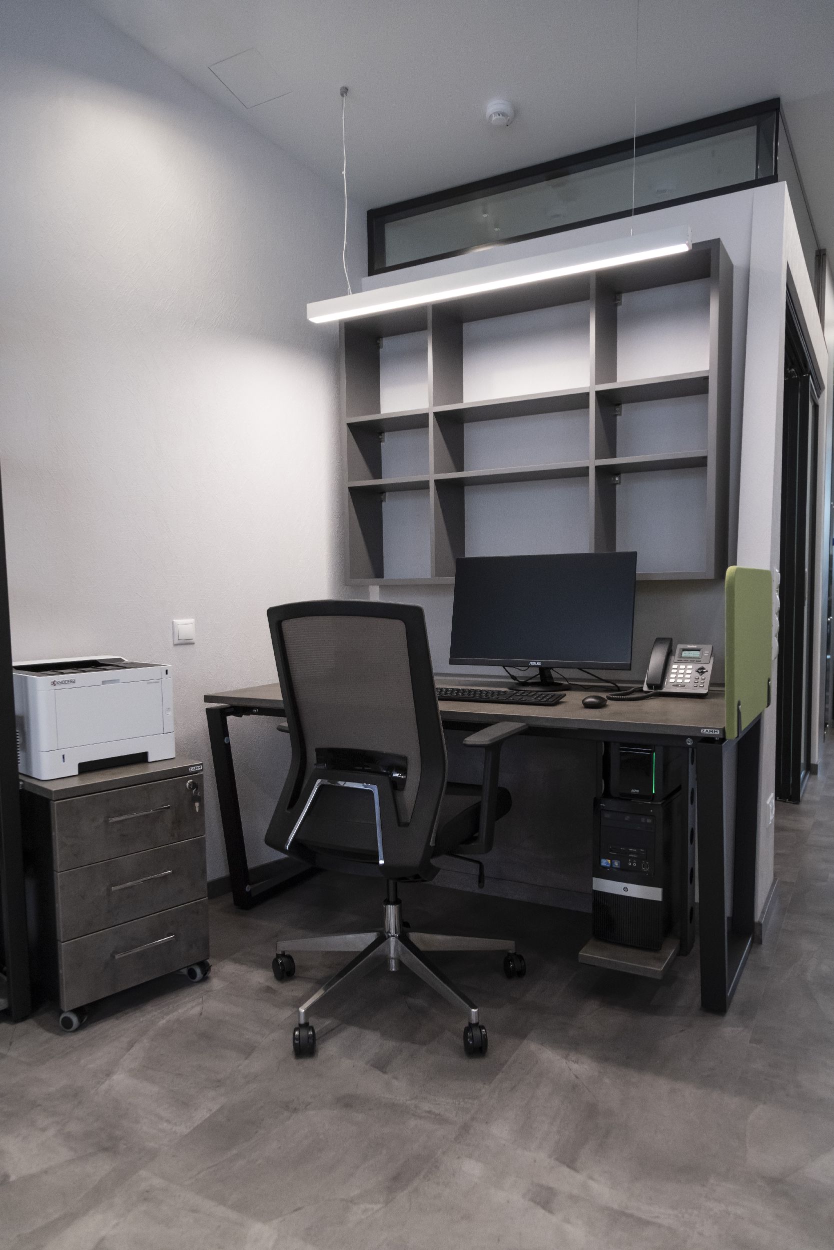 Офис юридической фирмы в серых тонах на Большой Бронной улице. В рабочей зоне размещены столы Ирис ТР в заказном цвете Бетон Чикаго темно-серый на черном металлокаркасе с зелеными войлочными экранами. Стеллажи, локеры и тумбы также выполнены в тон, поэтому вся мебель сочетается друг с другом и с интерьером.