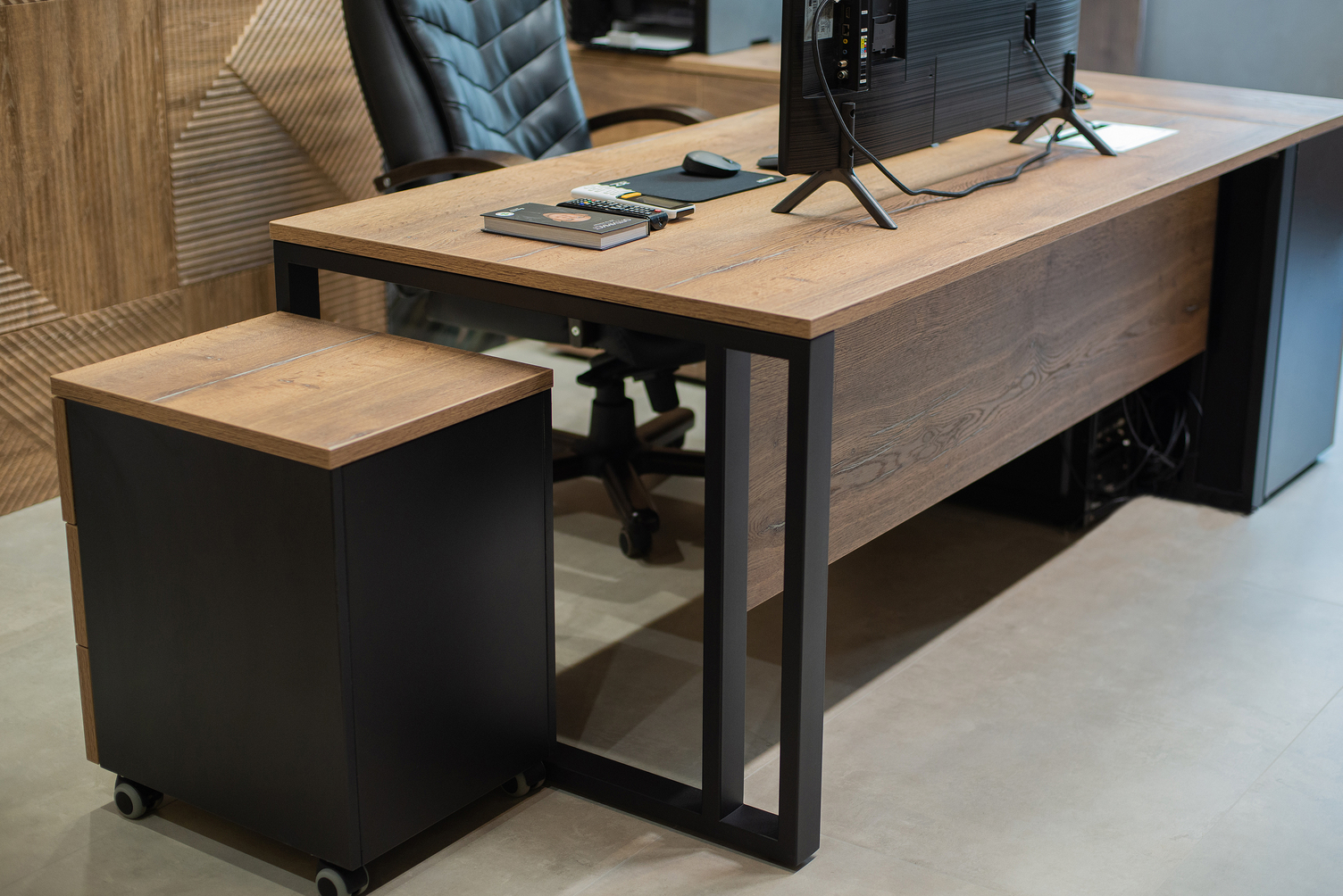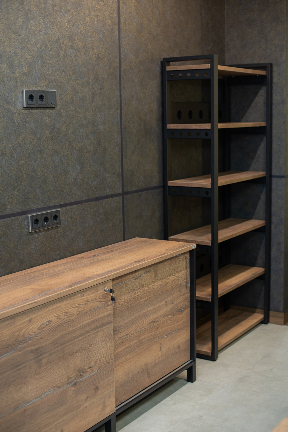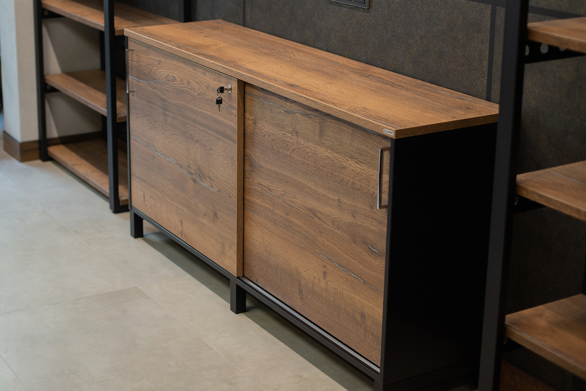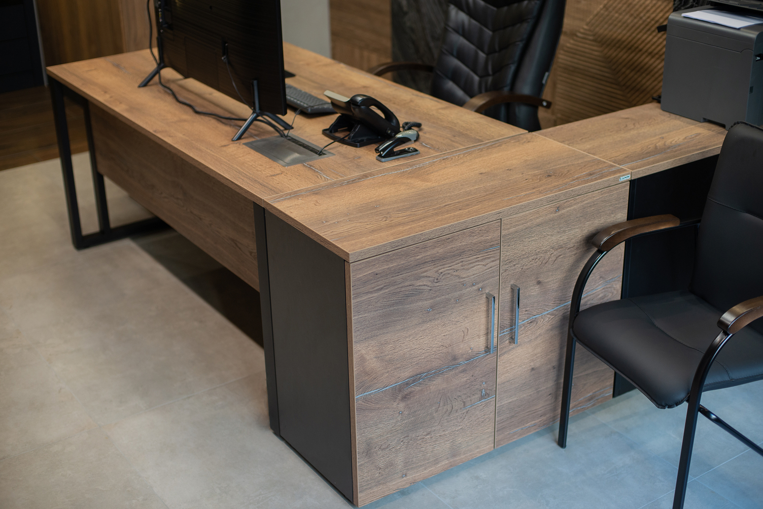 Вся мебель выполнена в цвете Дуб Галифакс олово/ Чёрный муар, что позволило создать атмосферный, стильный и функциональный офис.