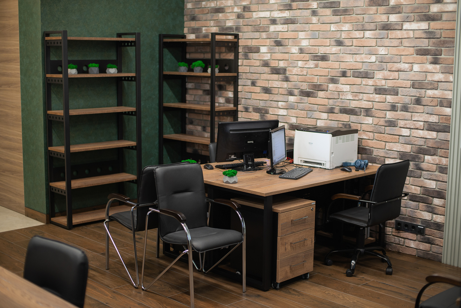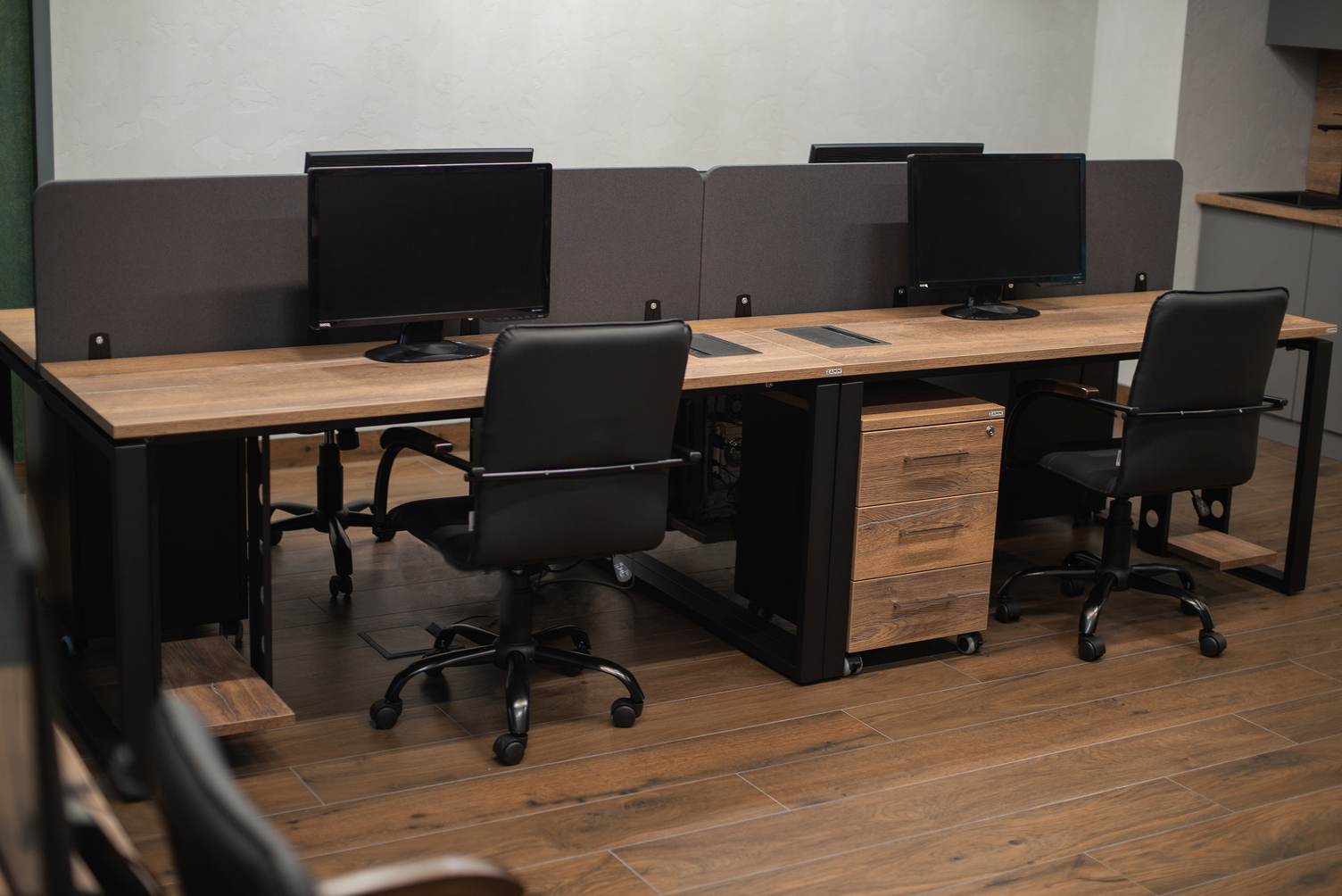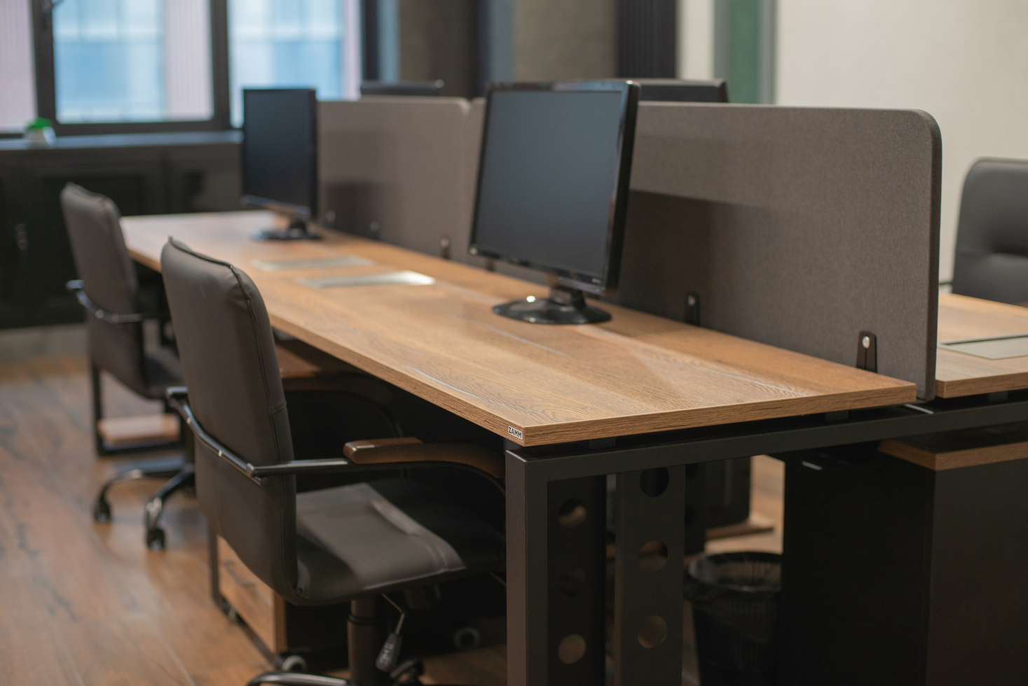 Для этого офиса наша команда подготовила столы на несколько рабочих мест - бенч-системе не базе столов Зета ТР с тканевыми перегородками, подвесами для системных блоков и лючками для проводов. Для удобства сотрудников к каждому рабочему месту прилетает мобильная тумба.