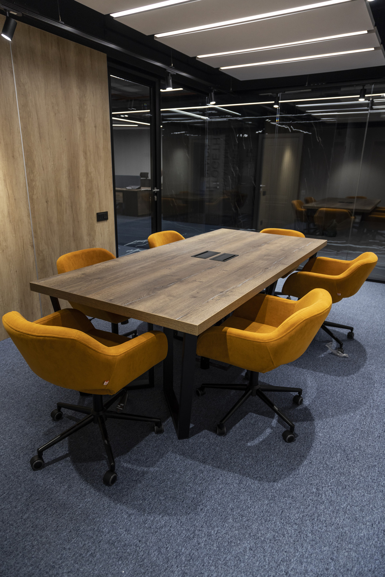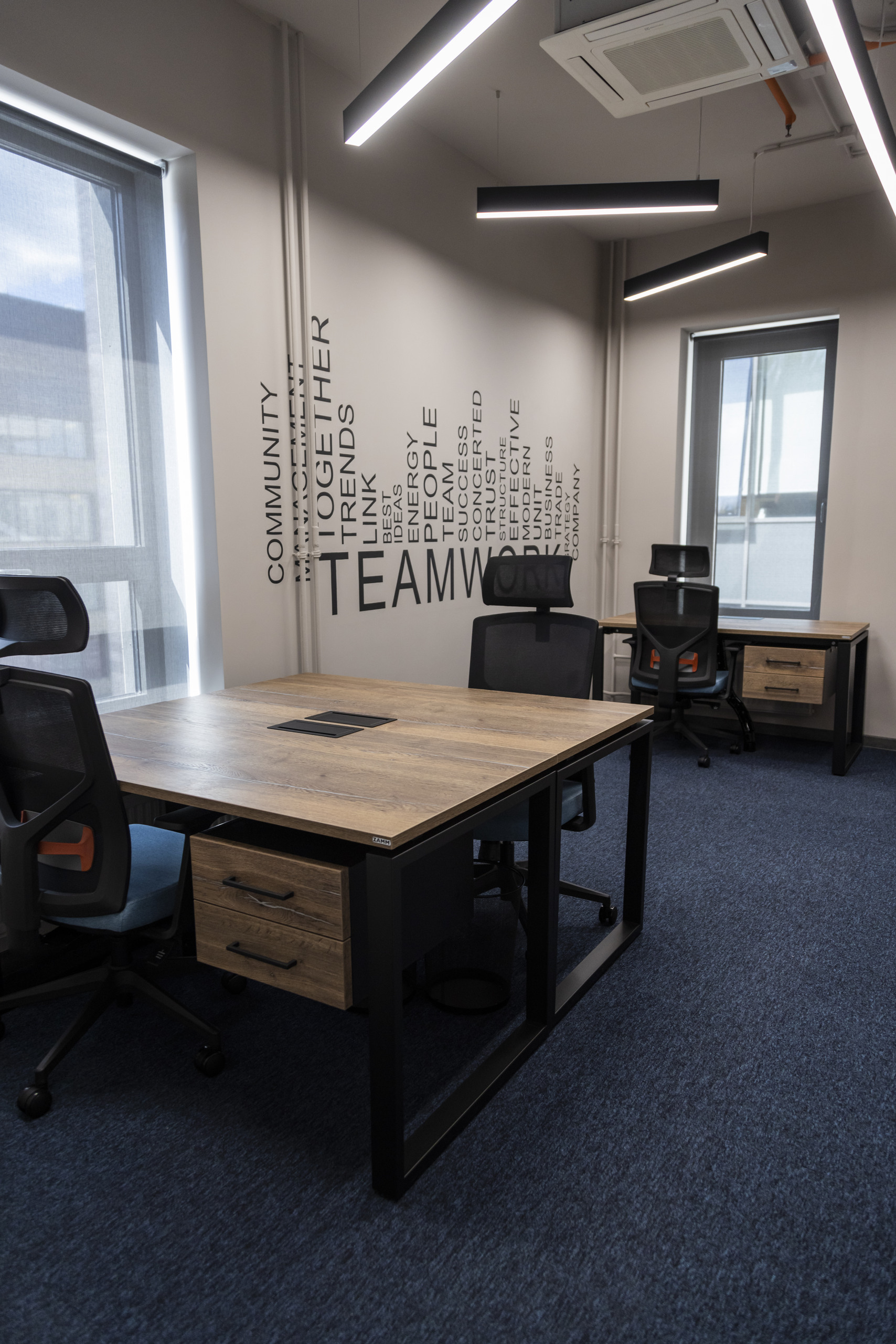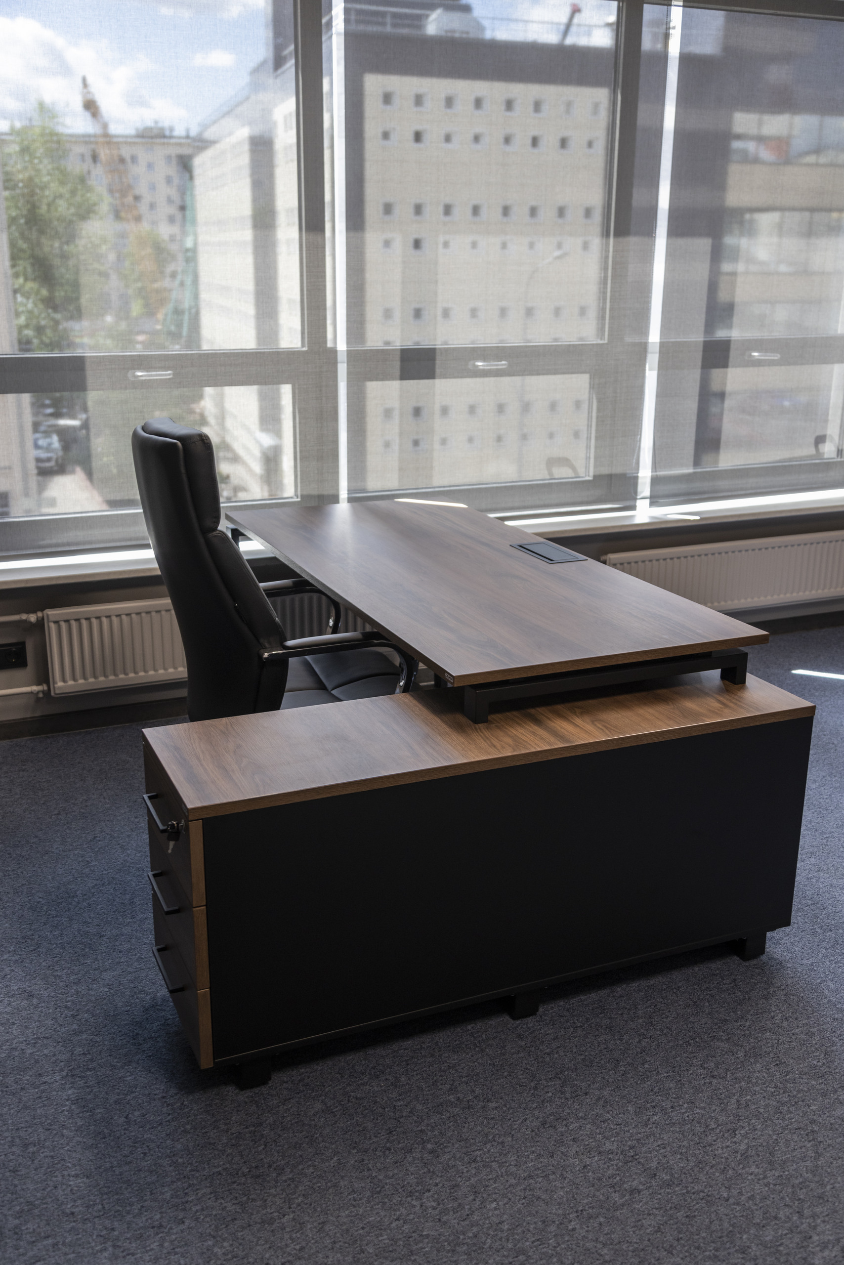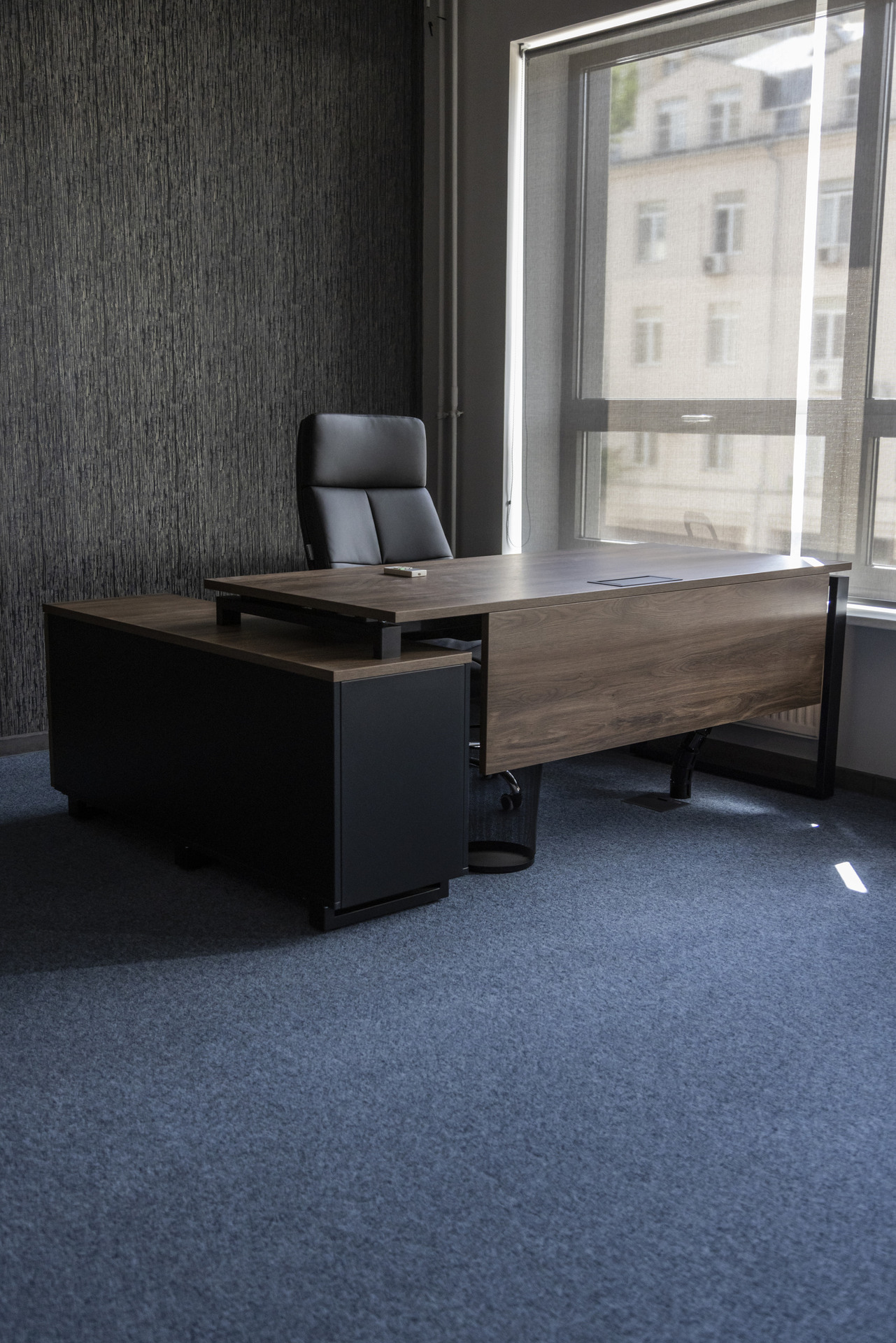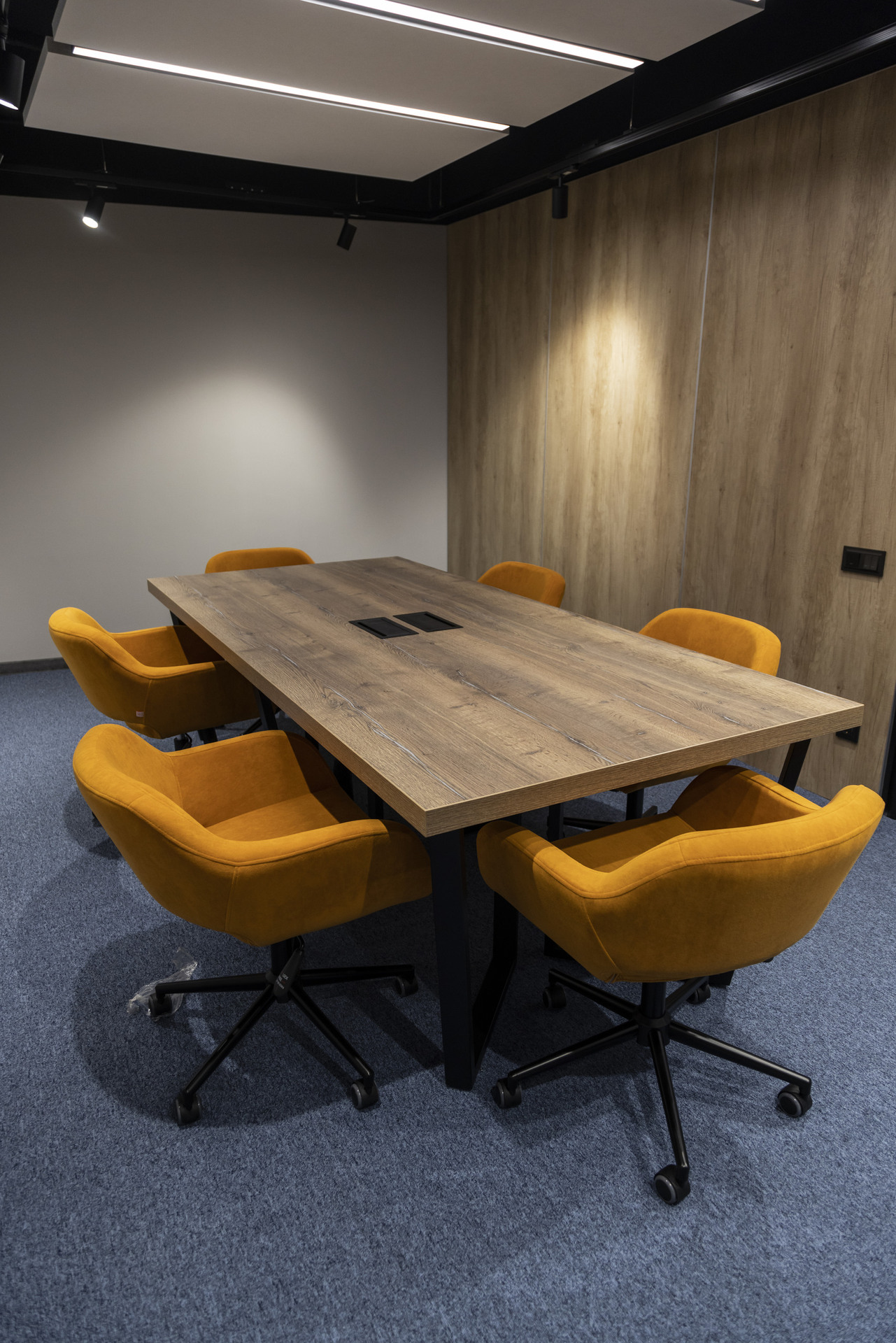 Конечно же стол для переговоров и стол для руководителя. Стильные, массивные - они задают тон всему помещению.