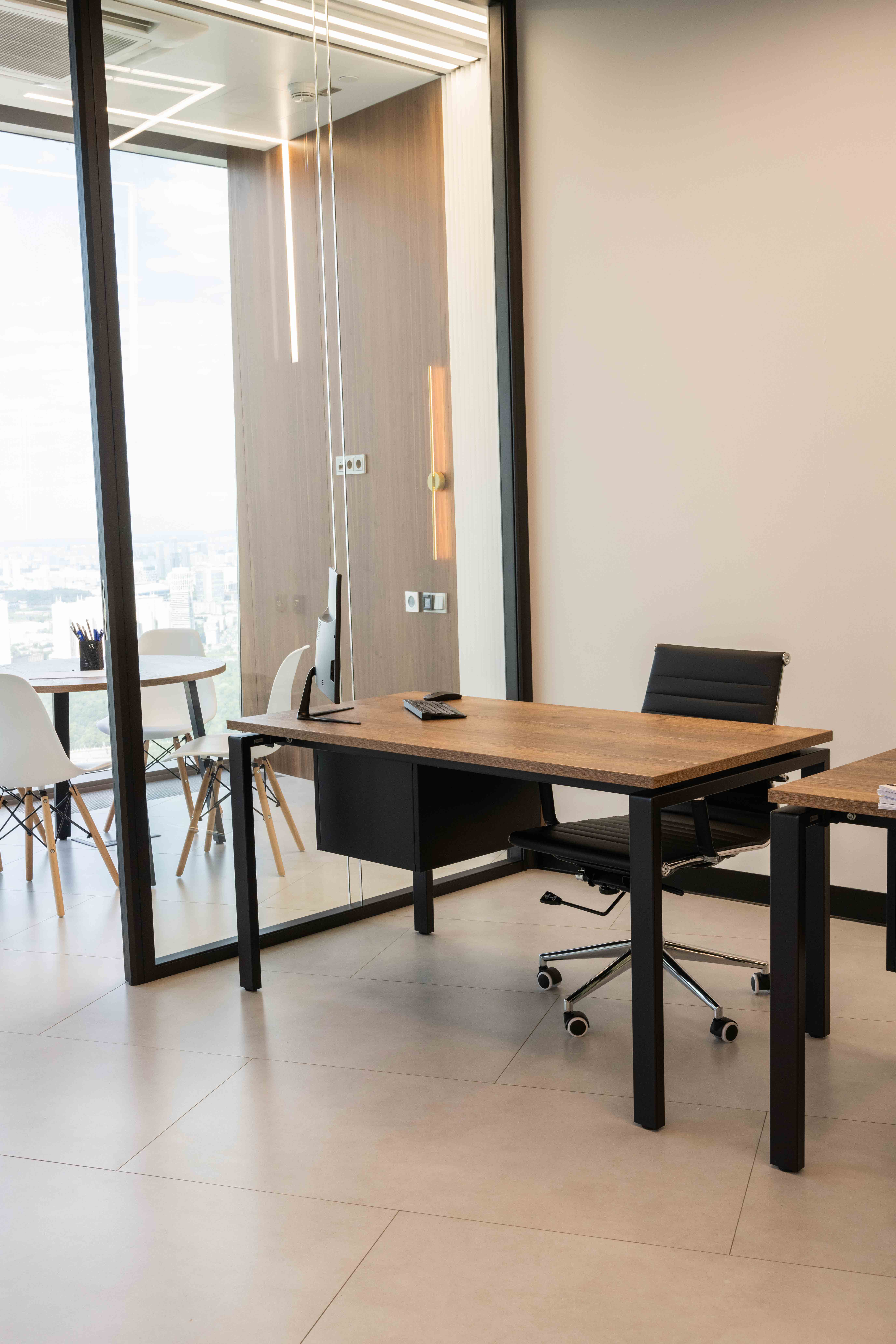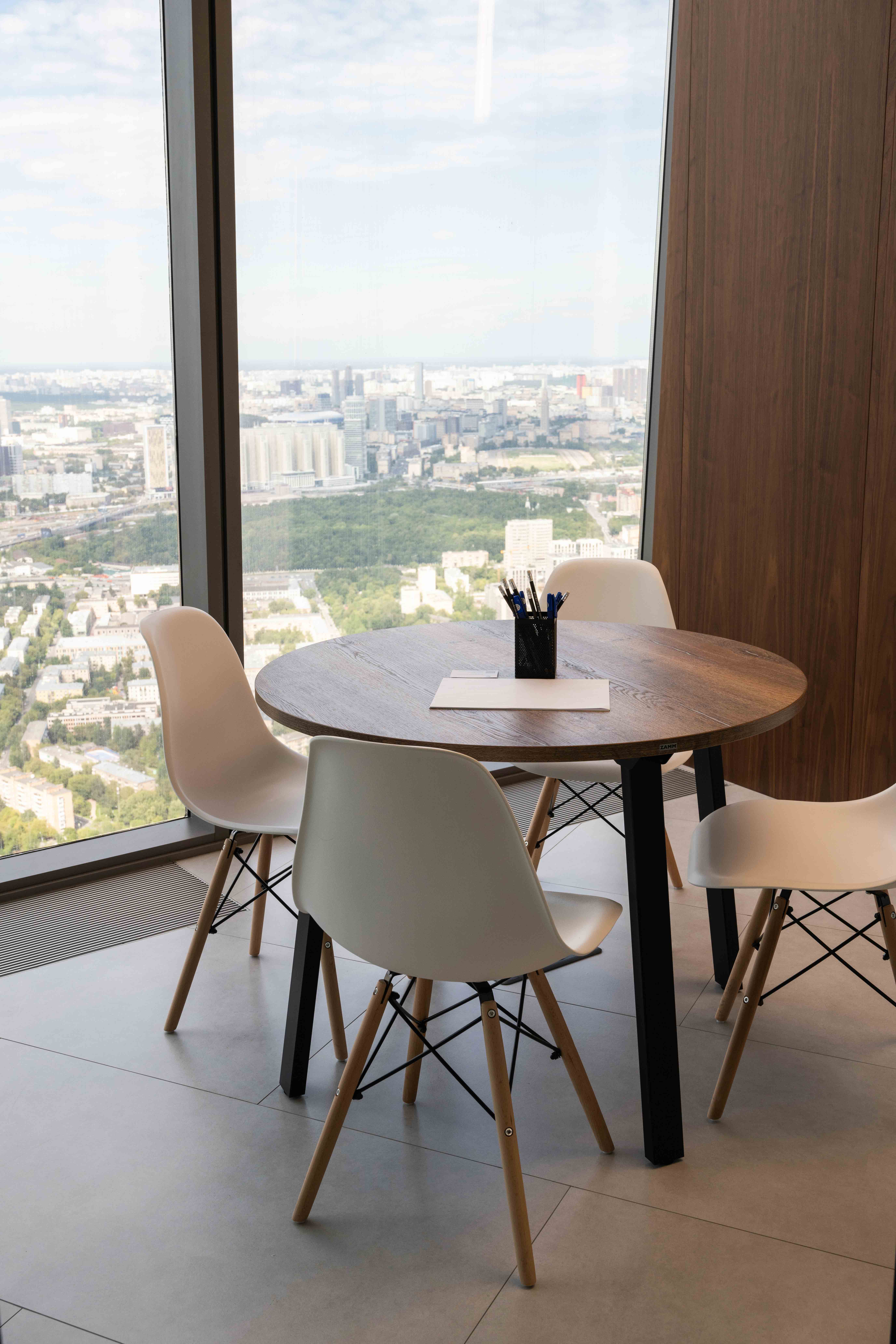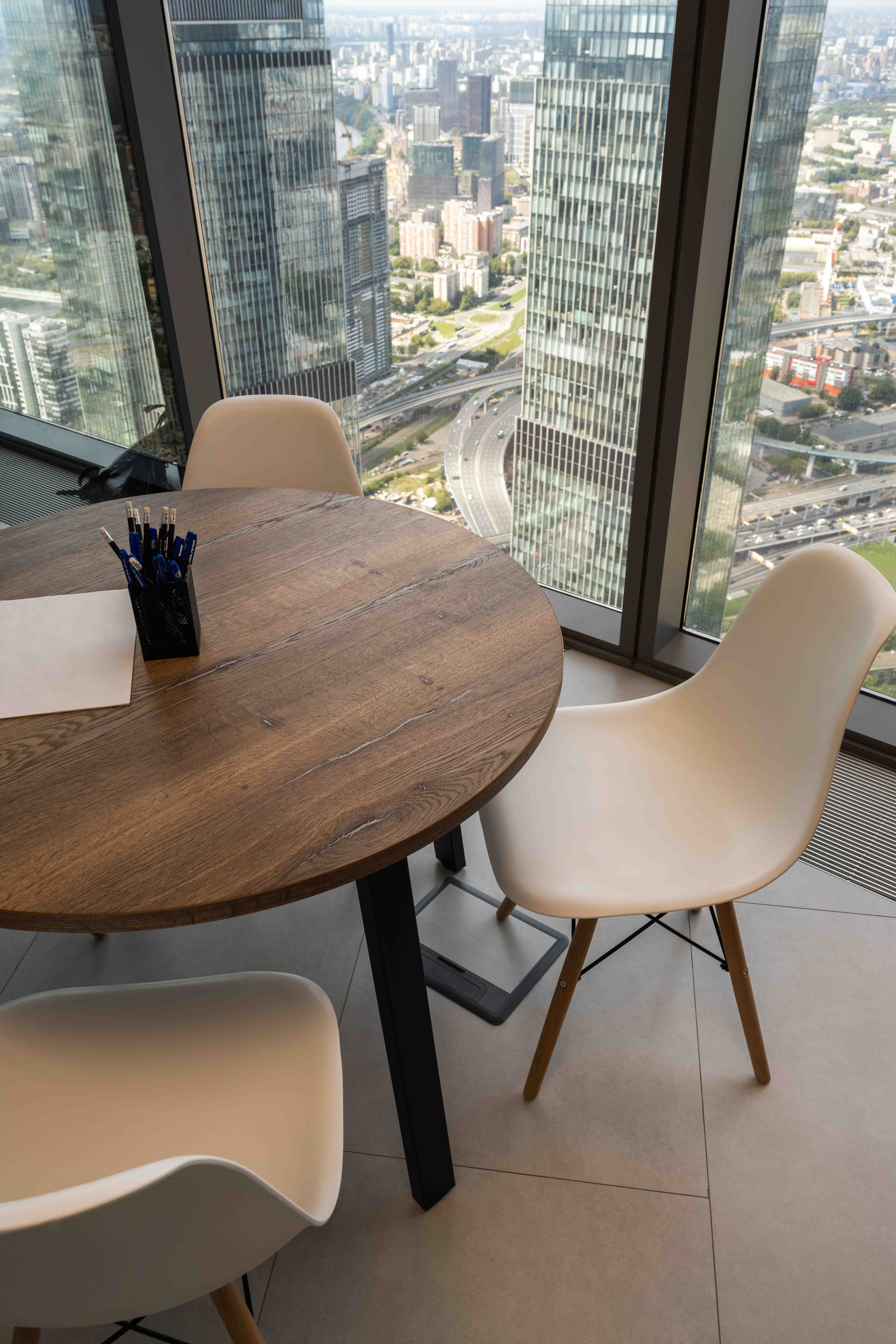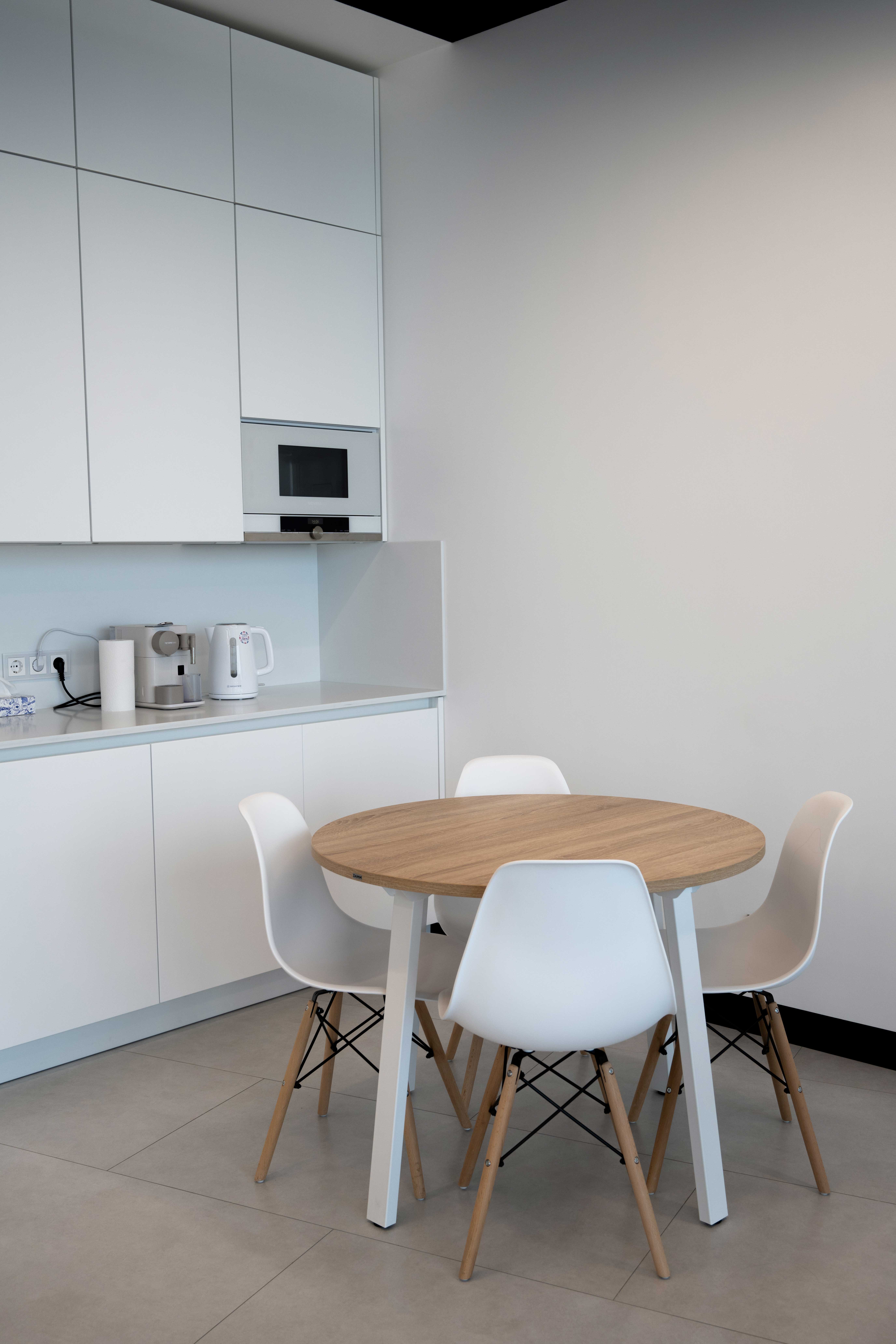 Наша Linda в благородном оттенке Дуб Галифакс потрясающе смотрится в кабинете руководства! А для сотрудников выбрана удобная минималистичная модель Формат ТР с двумя подвесными тумбами для хранения личных вещей и документов. На небольшой офисной кухне прекрасно поместился круглый кухонный стол, а еще один занял почетное место в переговорной зоне.