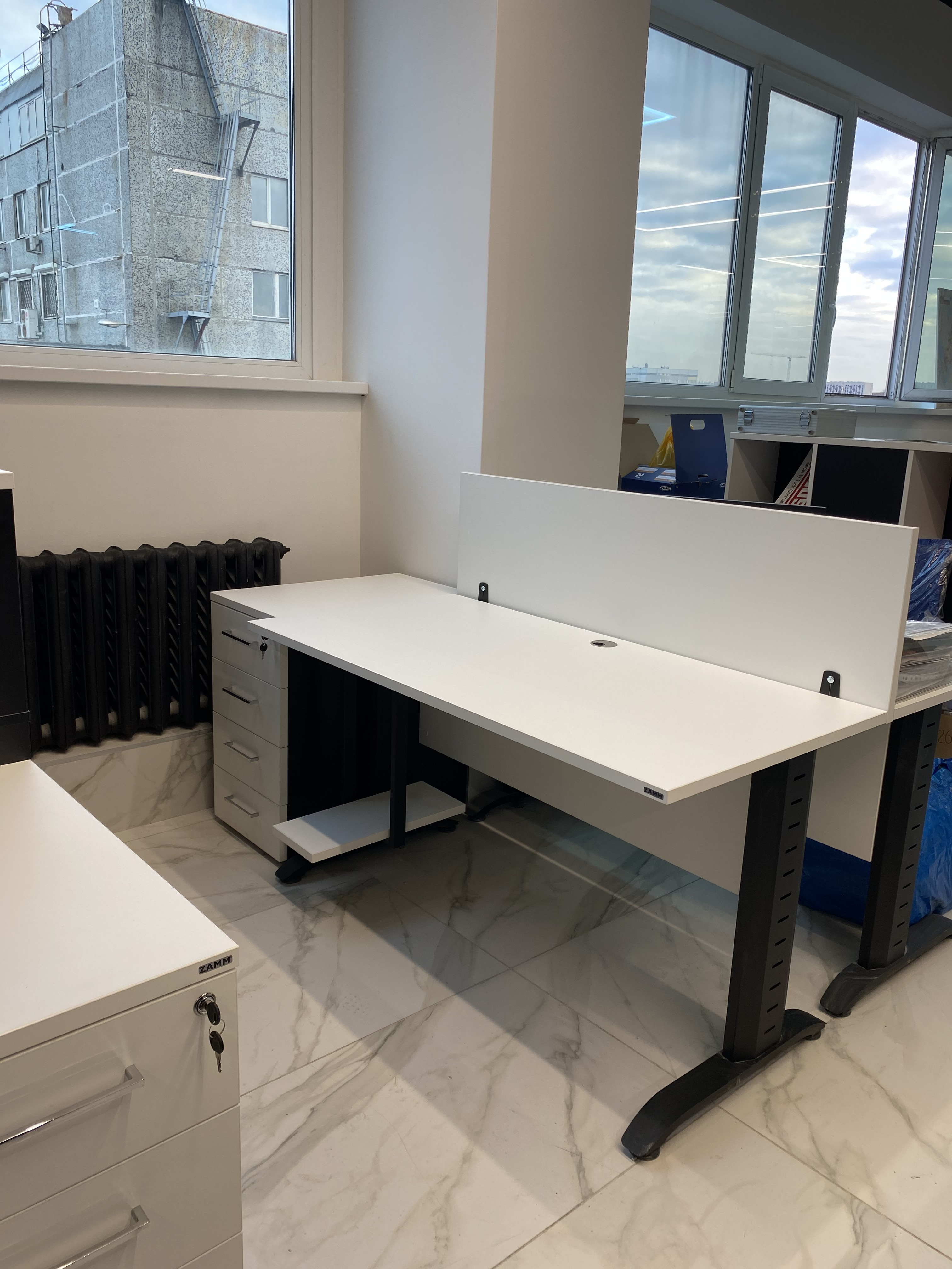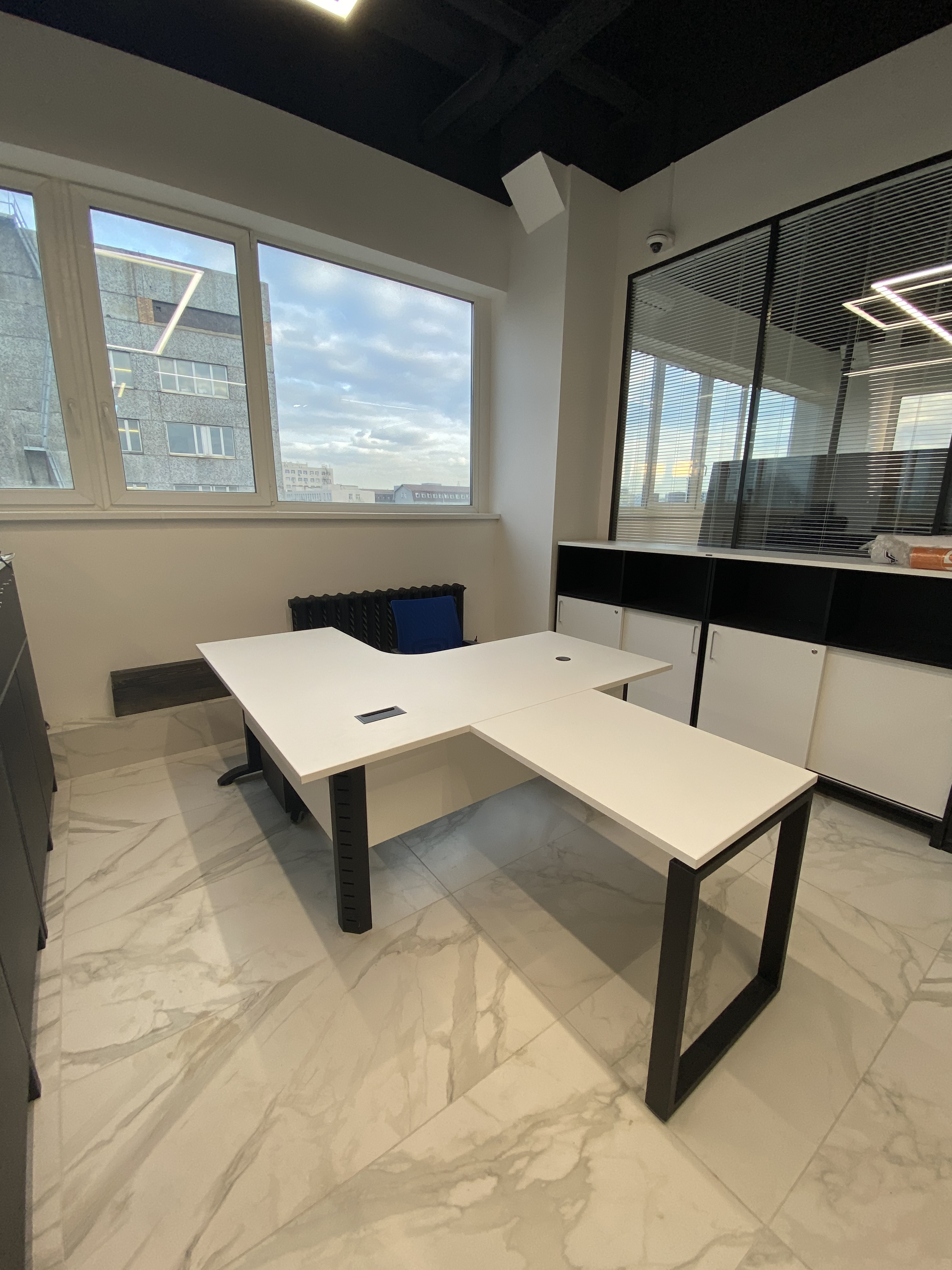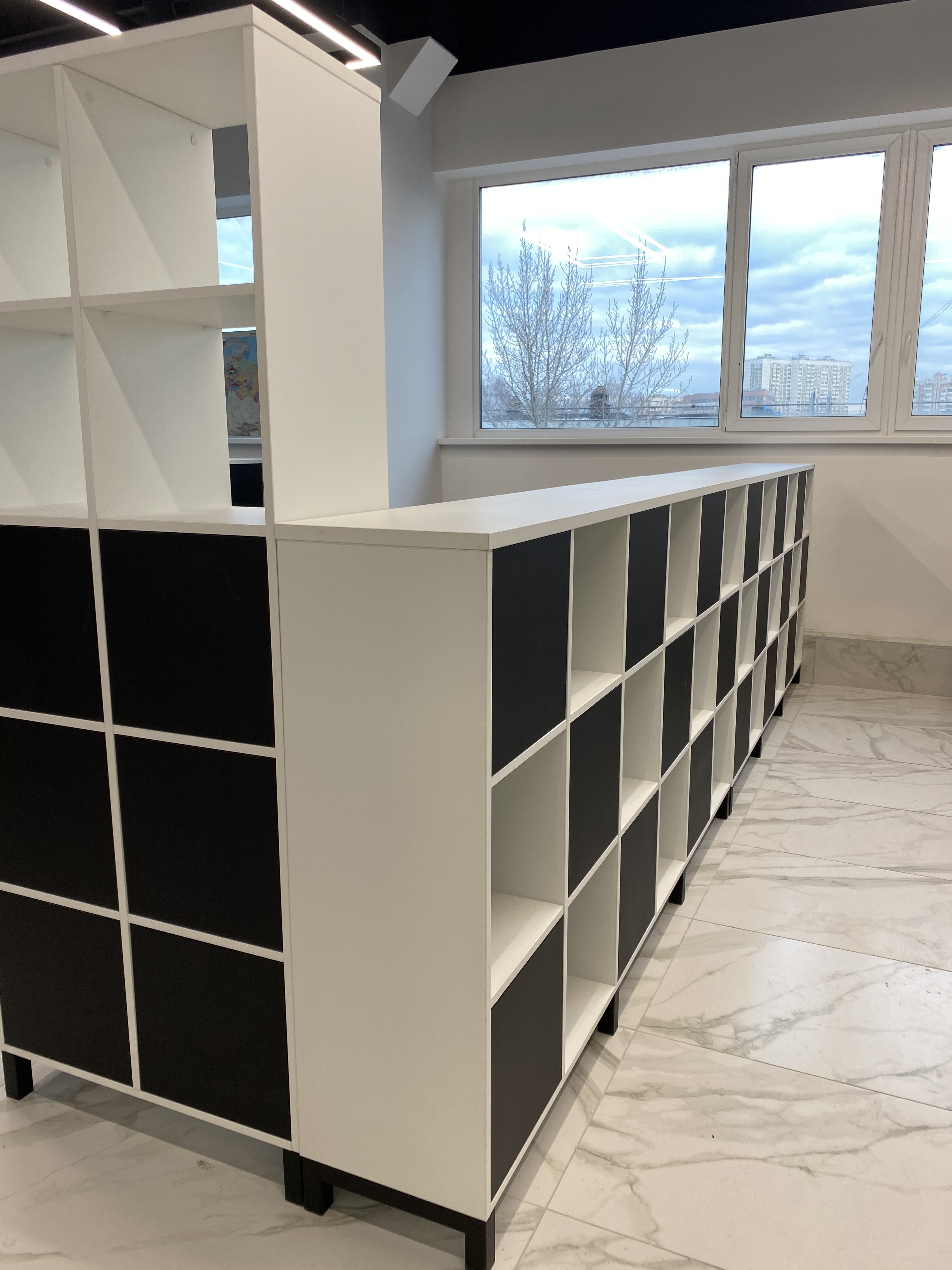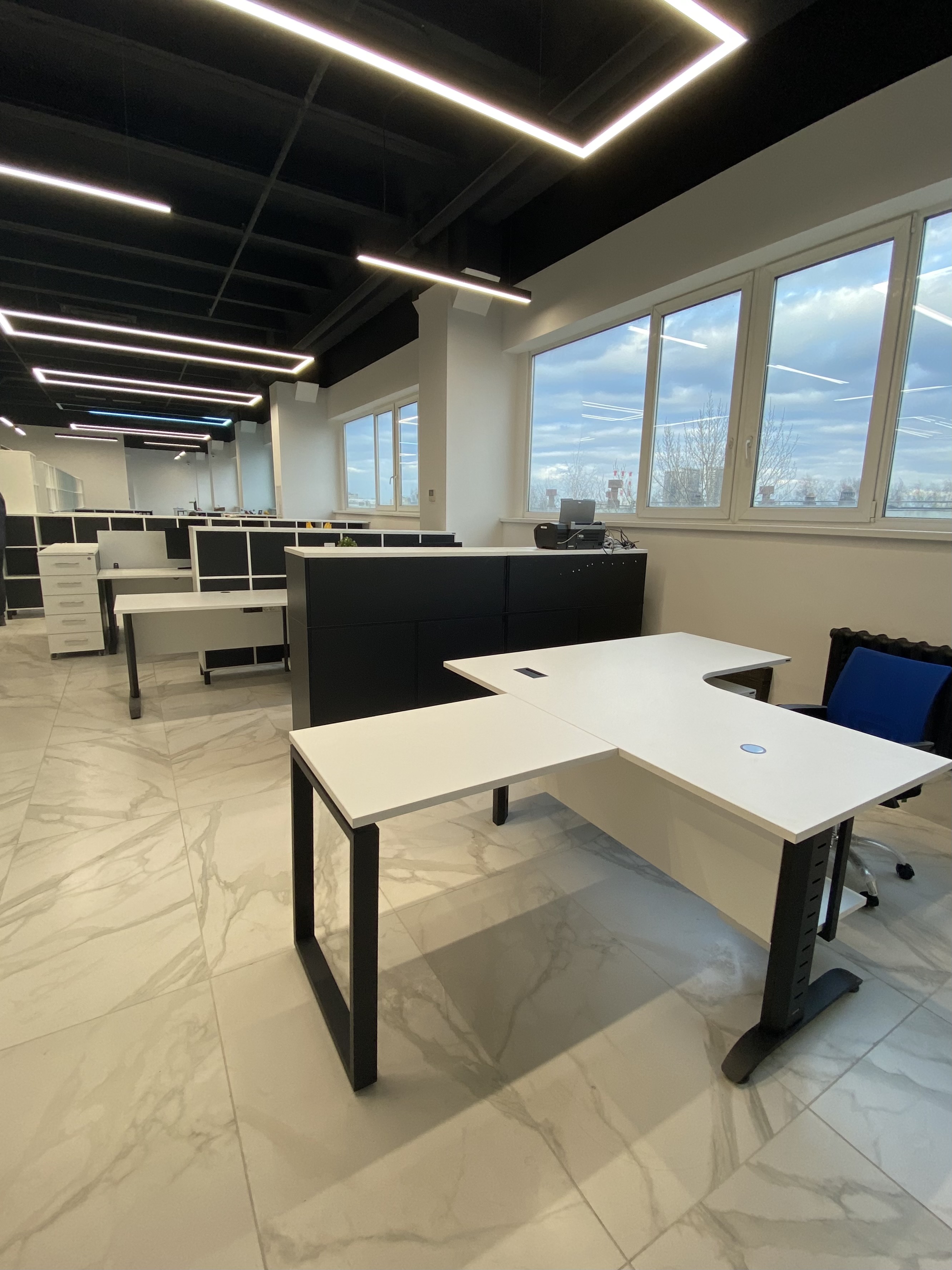 Минималистичный проект для офиса интернет-магазина вело и мототехники Велосити. В белом мраморном интерьере достойно выглядит корпусная мебель и столы в цвете Белый Премиум на черном металлокаркасе. Представлены модели Статус PRO с экраном ЛДСП, прямой стол для переговоров Зета и Пилот С. В кабинете руководителя размещен Гольф цвета ЛДСП Лес черный (на сайте не представлен, обращайтесь по телефону к нашим специалистам). В дополнение к столам идут локеры на две полки с надстройкой и стеллажные системы MIX.
