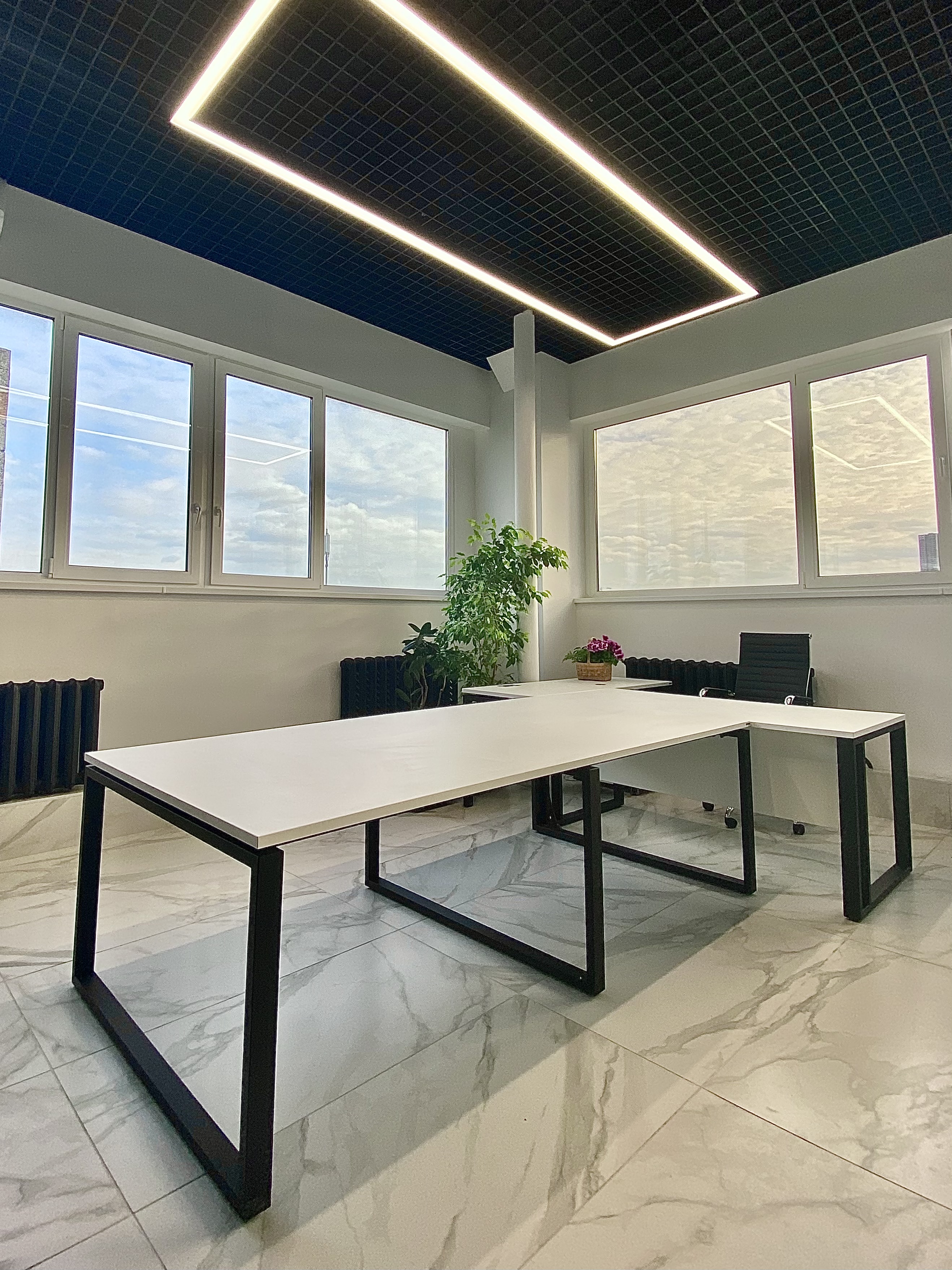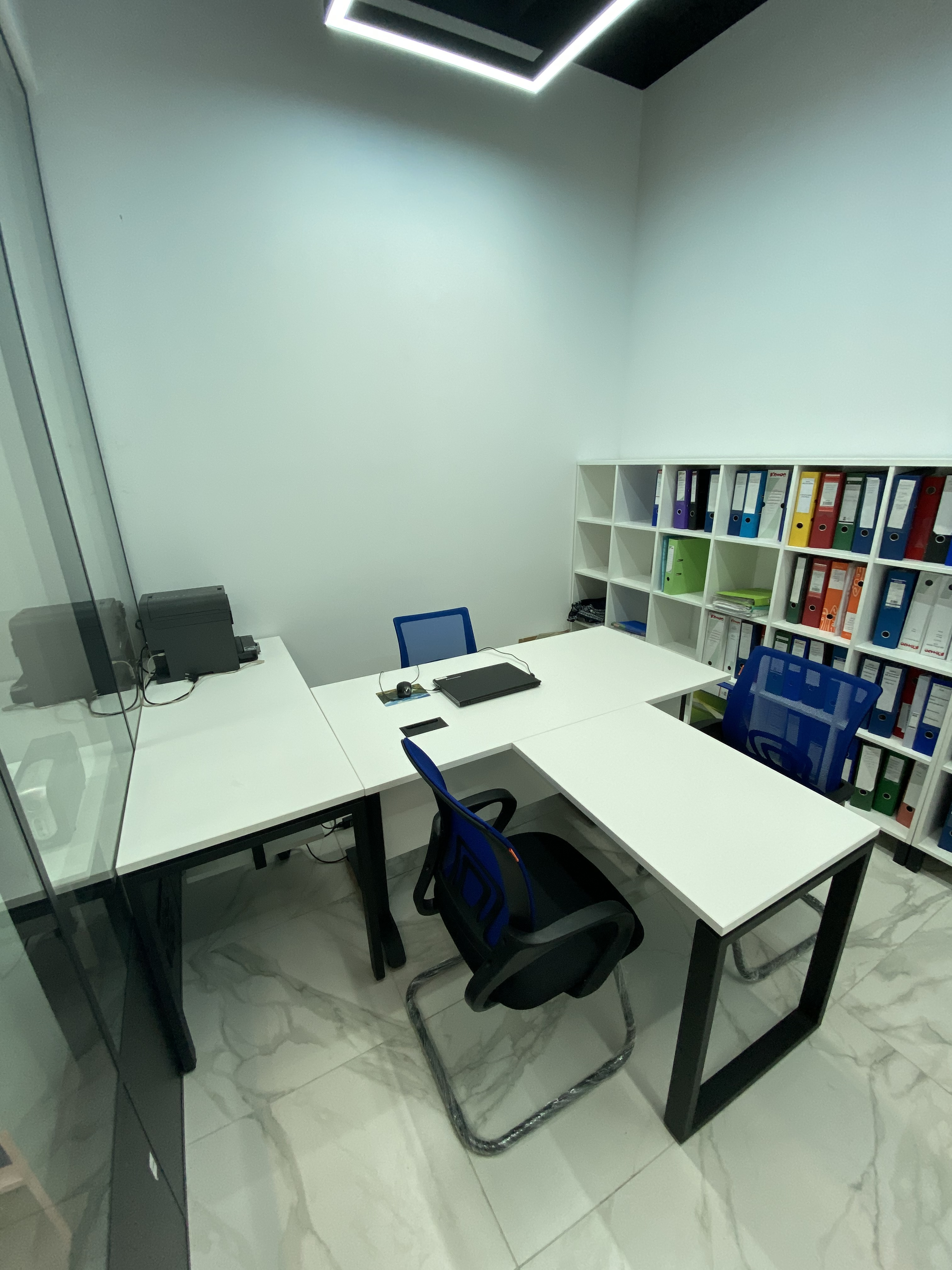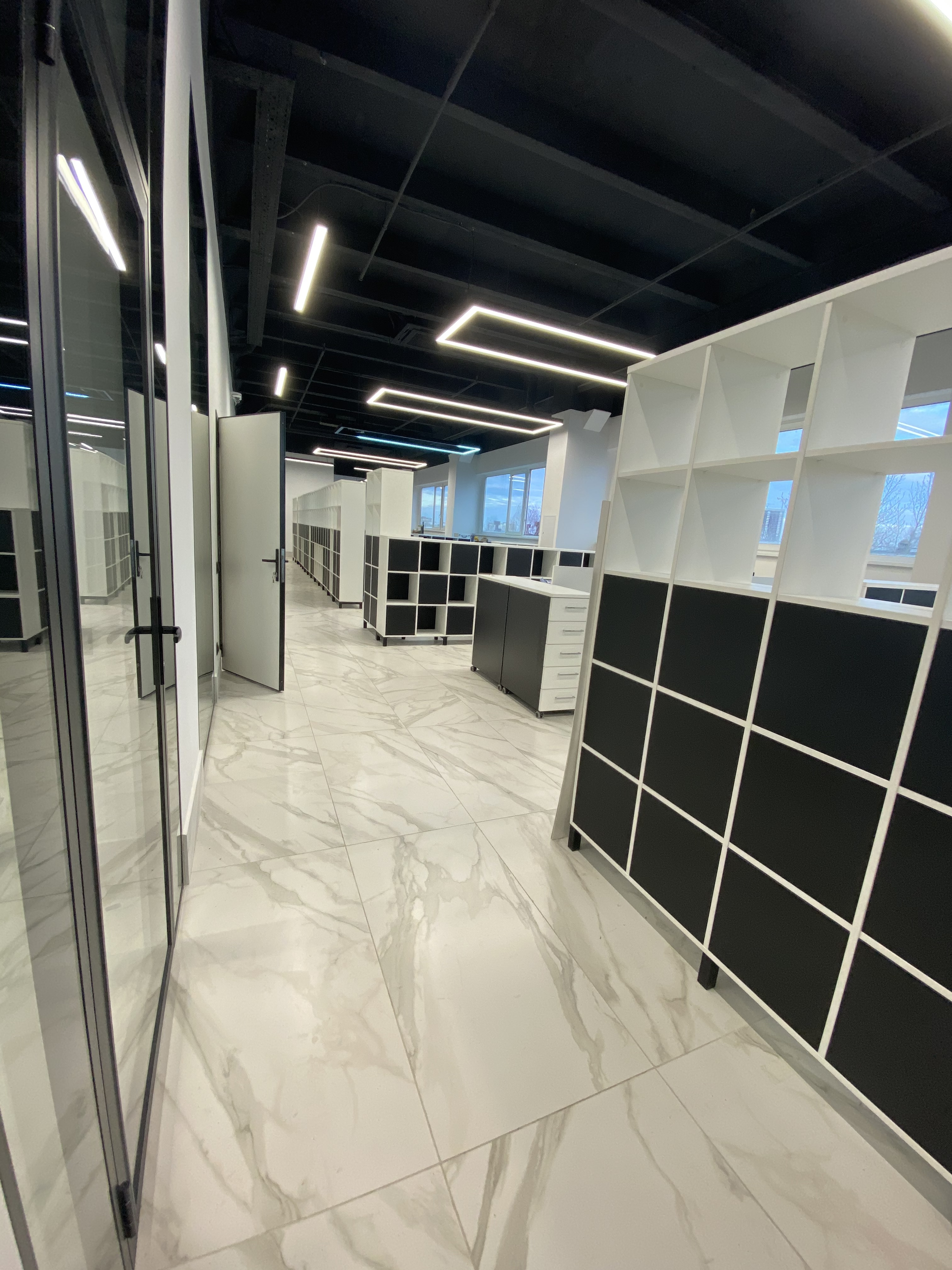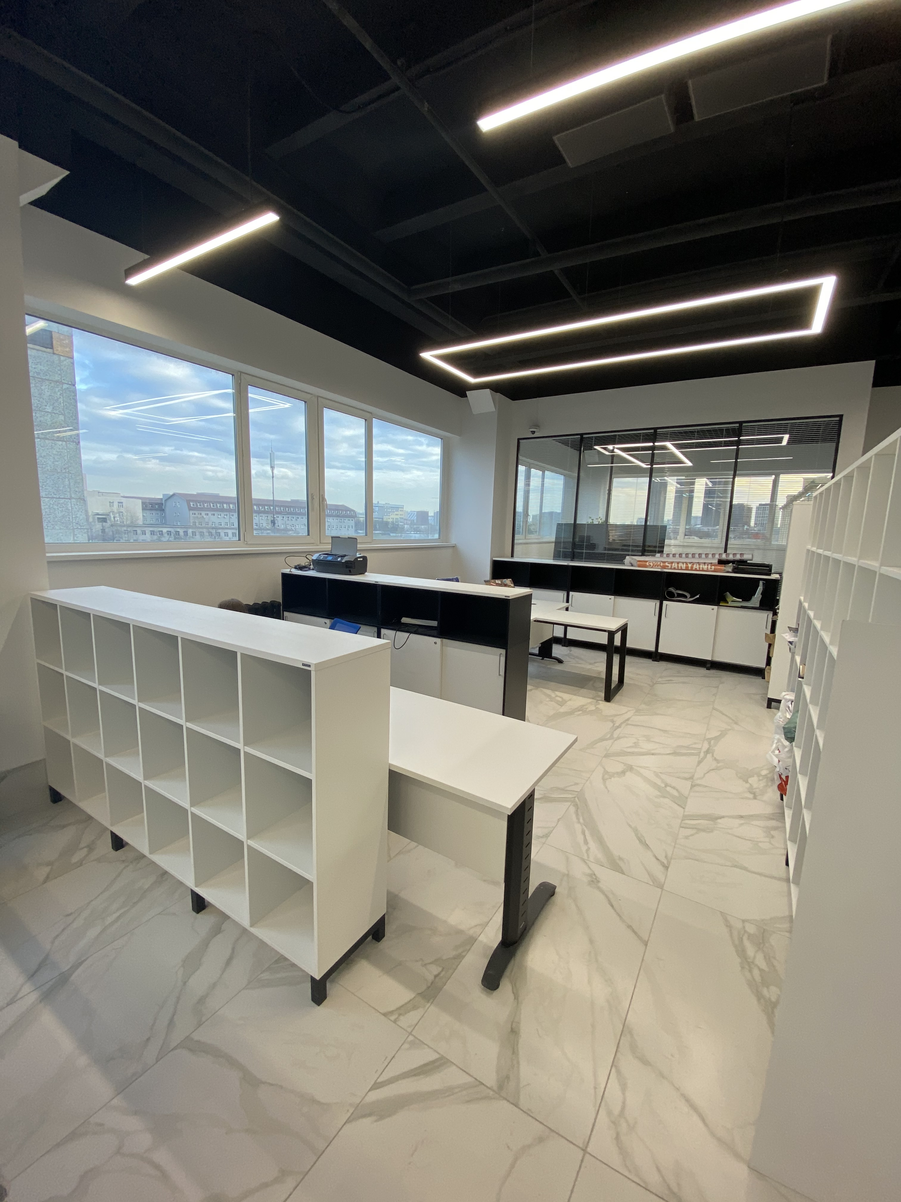 Минималистичный проект для офиса интернет-магазина вело и мототехники Велосити. В белом мраморном интерьере достойно выглядит корпусная мебель и столы в цвете Белый Премиум на черном металлокаркасе. Представлены модели Статус PRO с экраном ЛДСП, прямой стол для переговоров Зета и Пилот С. В кабинете руководителя размещен Гольф цвета ЛДСП Лес черный (на сайте не представлен, обращайтесь по телефону к нашим специалистам). В дополнение к столам идут локеры на две полки с надстройкой и стеллажные системы MIX.