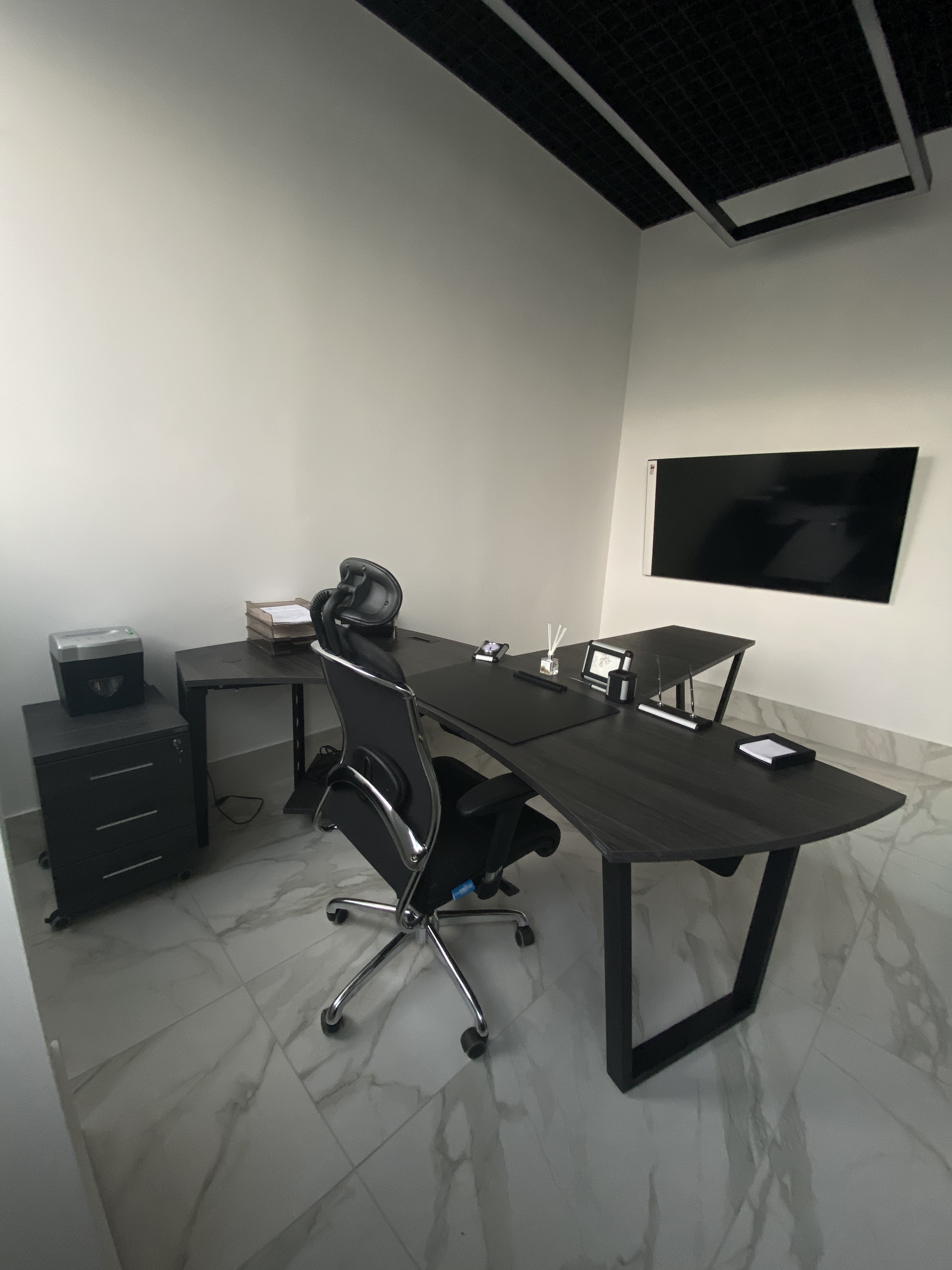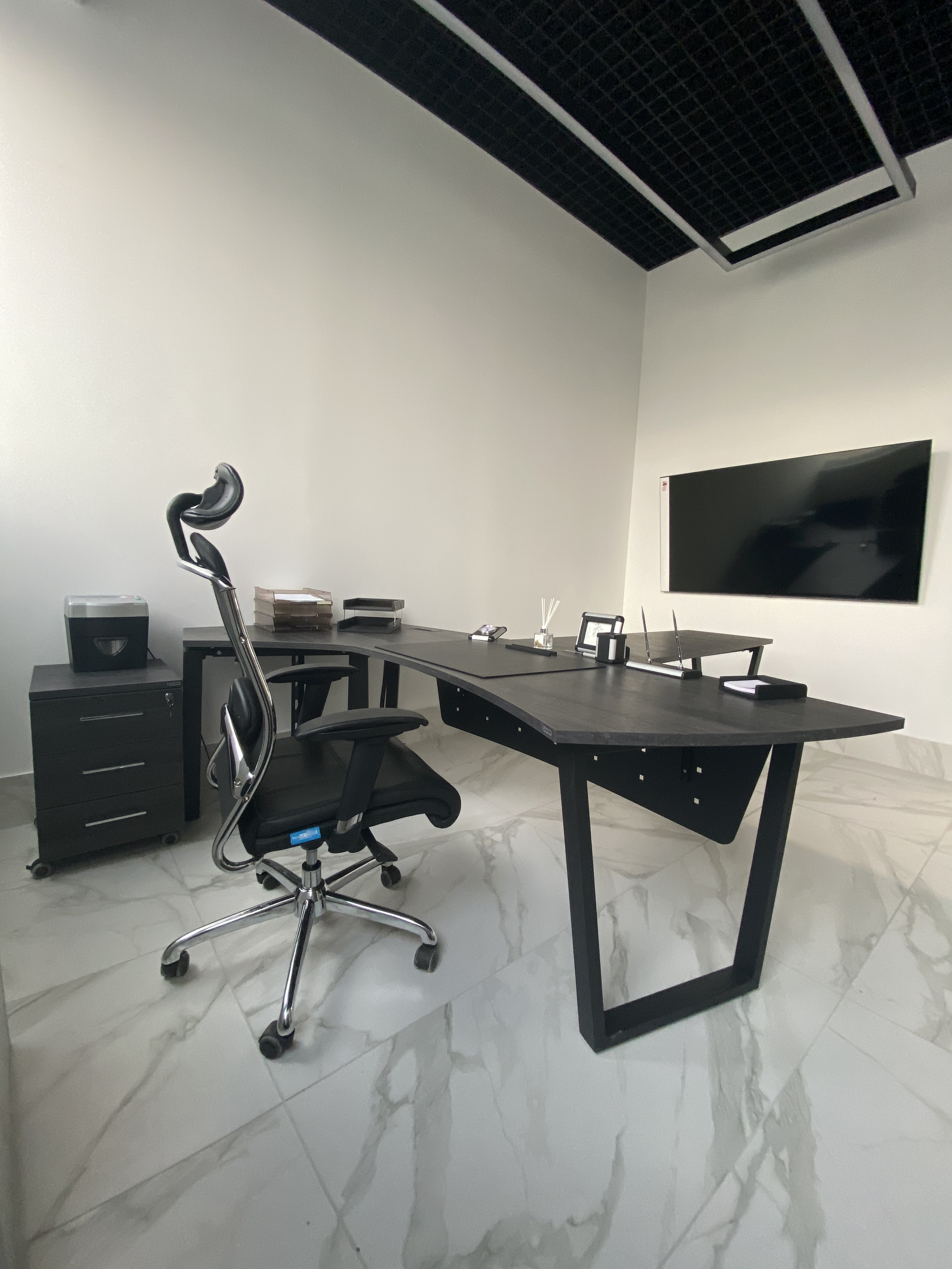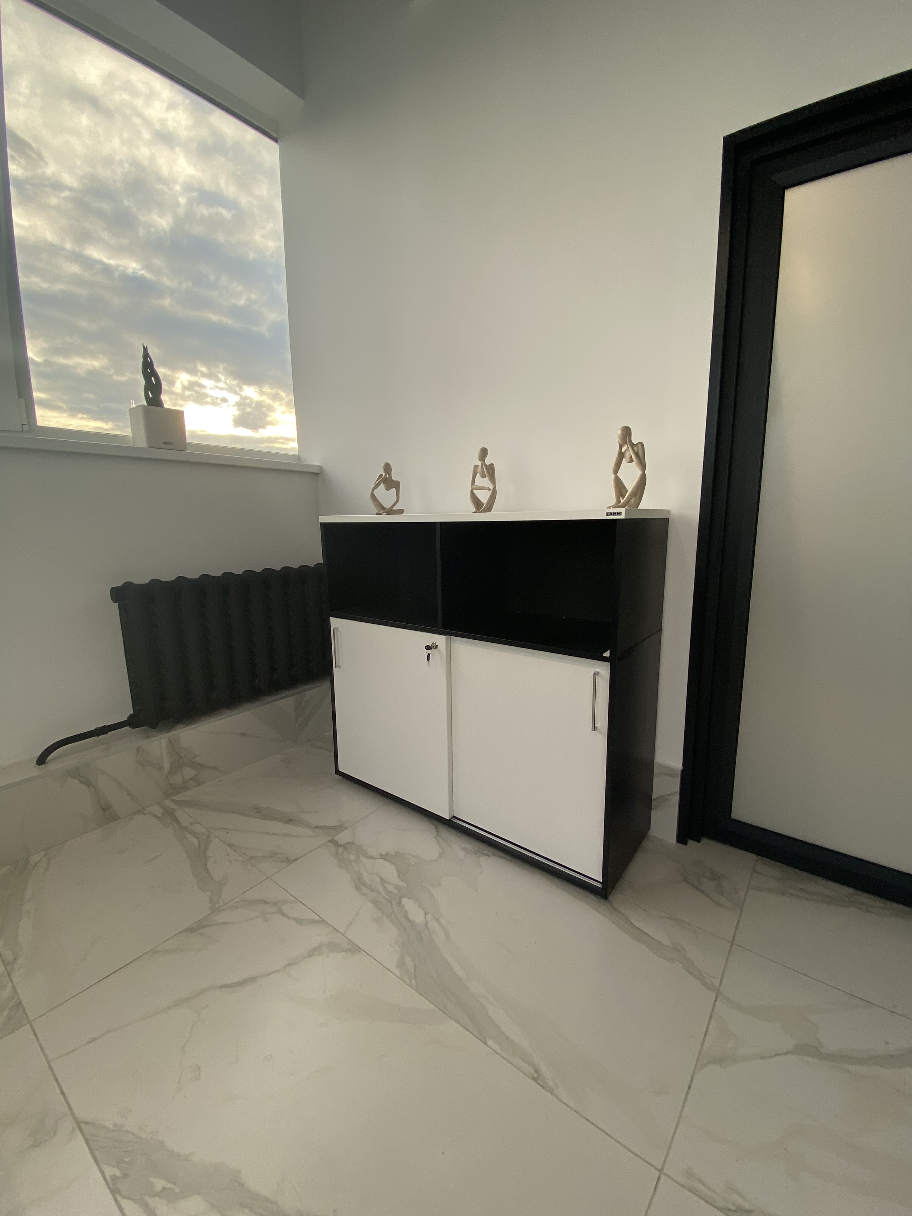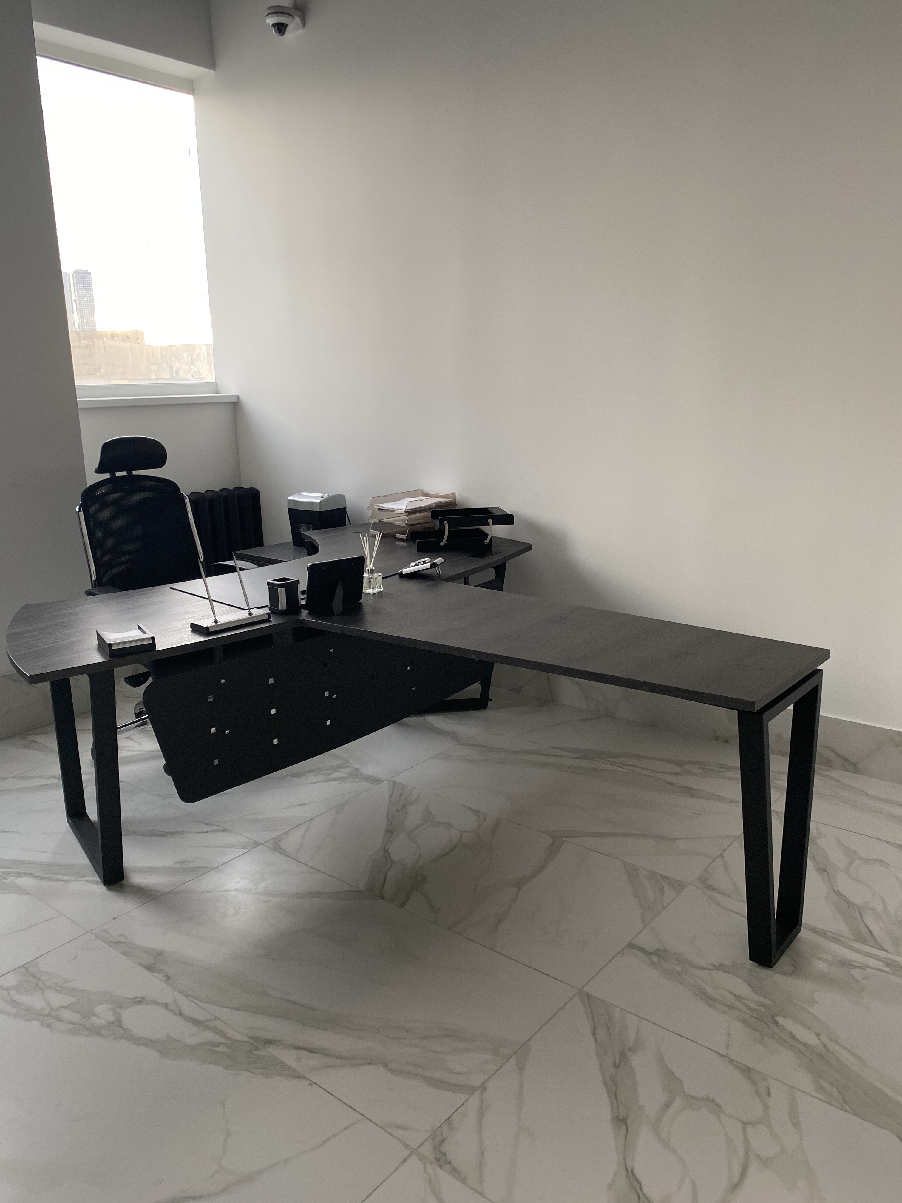 Минималистичный проект для офиса интернет-магазина вело и мототехники Велосити. В белом мраморном интерьере достойно выглядит корпусная мебель и столы в цвете Белый Премиум на черном металлокаркасе. Представлены модели Статус PRO с экраном ЛДСП, прямой стол для переговоров Зета и Пилот С. В кабинете руководителя размещен Гольф цвета ЛДСП Лес черный (на сайте не представлен, обращайтесь по телефону к нашим специалистам). В дополнение к столам идут локеры на две полки с надстройкой и стеллажные системы MIX.